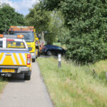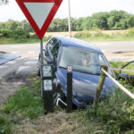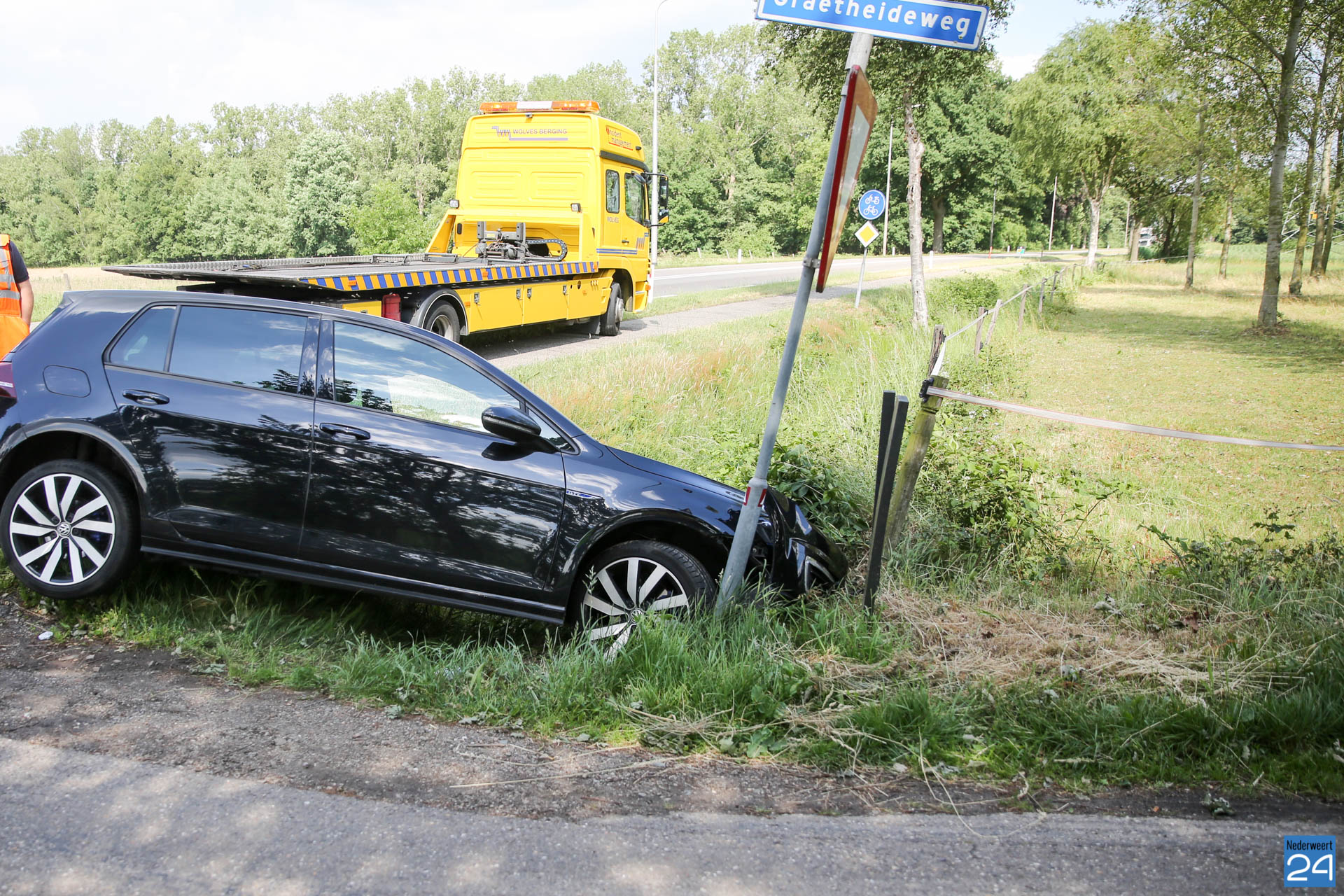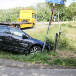 De bestuurder had te laat gezien waar hij rechtsaf moest. Hierdoor miste hij de bocht, knalde tegen een verkeersbord aan en kwam uiteindelijk in de sloot tot stilstand. “Ik zag te laat waar ik af moest. Ik remde flink en stuurde in met als gevolg dat ik uit de bocht vloog,” vertelt de automobilist. Niemand raakte gewond. De auto is met flink wat schade aan de voorzijde afgesleept door een berger.