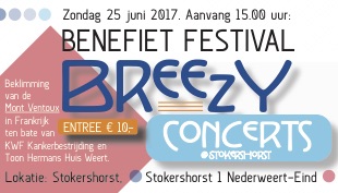 Datum zondag 25 juni | Poorten open 14.00 uur | Aanvang 15.00 uur tot 22.30 uur | Entree € 10,00 | Locatie Stokershorst 1, Nederweert-Eind. De organisatie is in handen van Fien Leenders, Sjaak Krebbers, Rob Bos, Hans Dohmen en Bert Vossen. Meer informatie: www.stokershorst.com / facebook: Breezy Concerts / Bert 0624765795