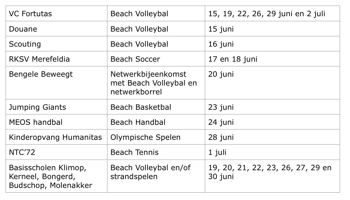De parkeerplaats naast sporthal de Bengele is weer voorzien van een flinke laag strandzand voor twee volle weken (15 juni – 2 juli) sportief plezier met diverse toernooien; Beach Volleybal, Beach Handbal, Beach Soccer, Beach Basketbal en Beach Tennis. Daarnaast maken de basisscholen, scouting en de kinderopvang volop sportief gebruik van de beachvelden. Kortom, een vol programma met voor ieders wat wils!