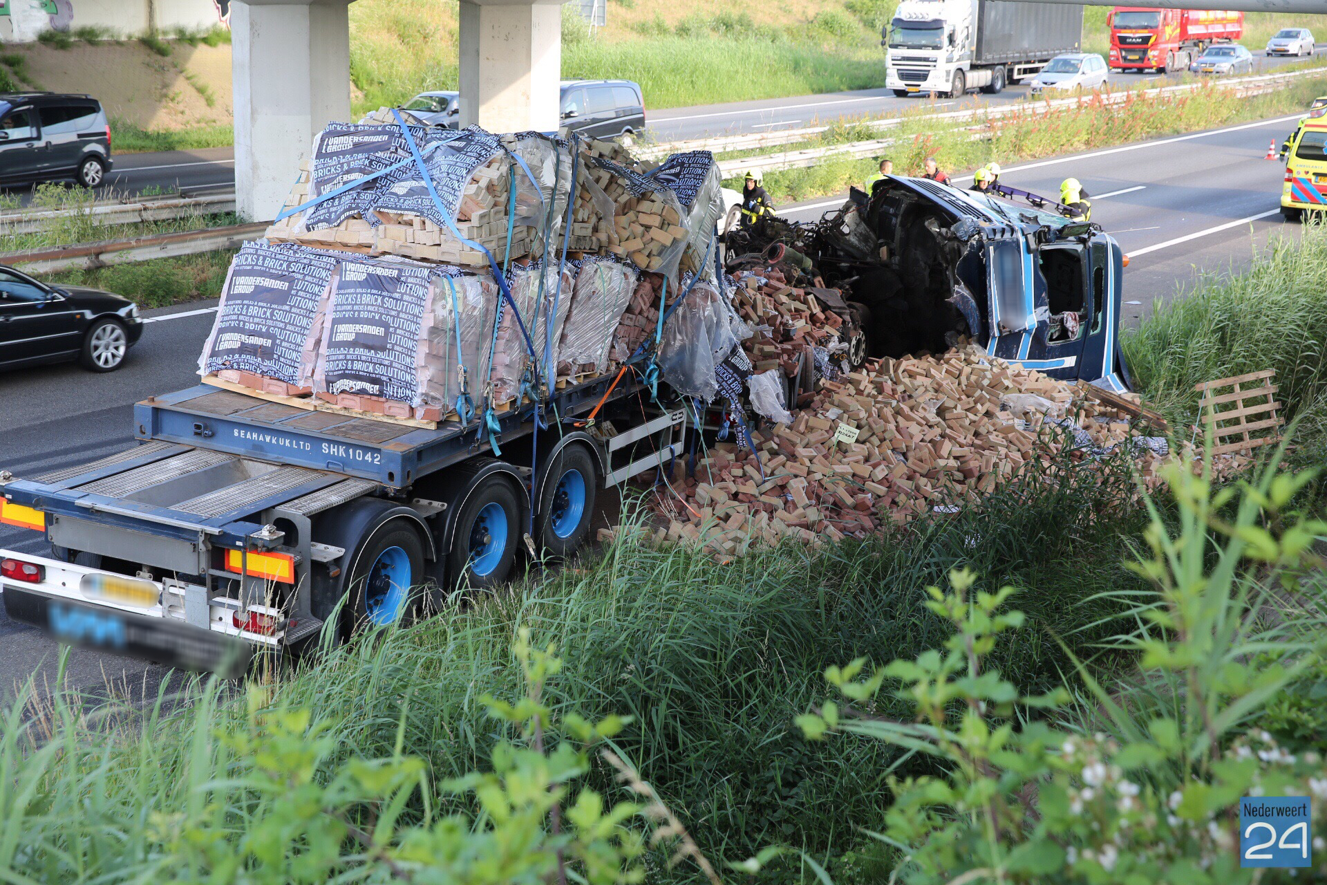 Donderdagochtend is een vrachtwagen geladen met bakstenen gekanteld op de A2 net onder de spoorbrug bij Nederweert. Een collega die achter hem reed, ook geladen met bakstenen, is gestopt en heeft de hulpdiensten gebeld.