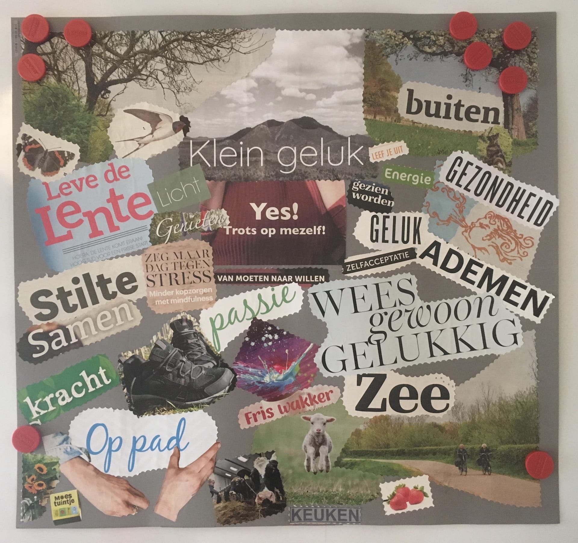 Eerst beginnen ze met een opsomming van dingen die ze anders willen maar gaandeweg zo’n Mindfulness-traject wordt steeds duidelijker wat ze wel willen. Thuis werken ze dat dan verder uit in een zogeheten ‘Moodboard’ waar een visie achter zit, namelijk hun eigen visie. Altijd een leuk moment in zo’n traject. Mooi om te zien hoe het antwoord op deze vraag gaandeweg verandert van het verkrijgen van materiële zaken zoals een nieuwe auto, een groter huis, naar dingen zoals een boswandeling en tijd en aandacht voor familie en vrienden. Dus van dingen die mooi en handig zijn naar dingen die je ruimte geven, die bijdragen aan een gezond en gelukkig leven waarin ze zingeving vinden.
