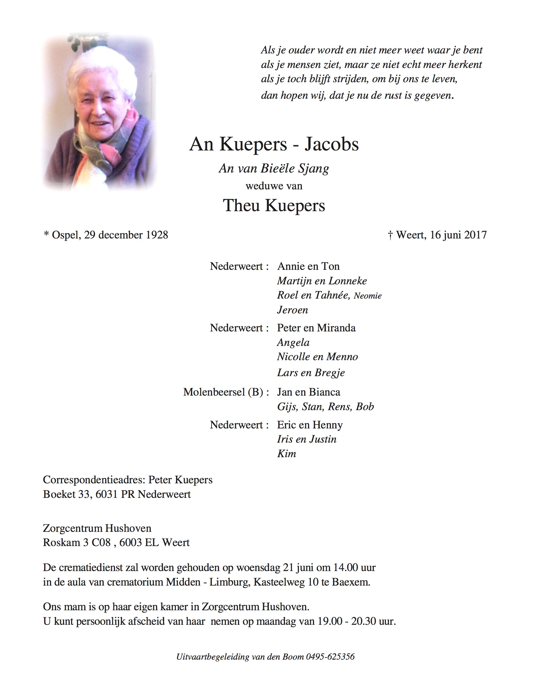 Overlijdensbericht: An Kuepers – Jacobs