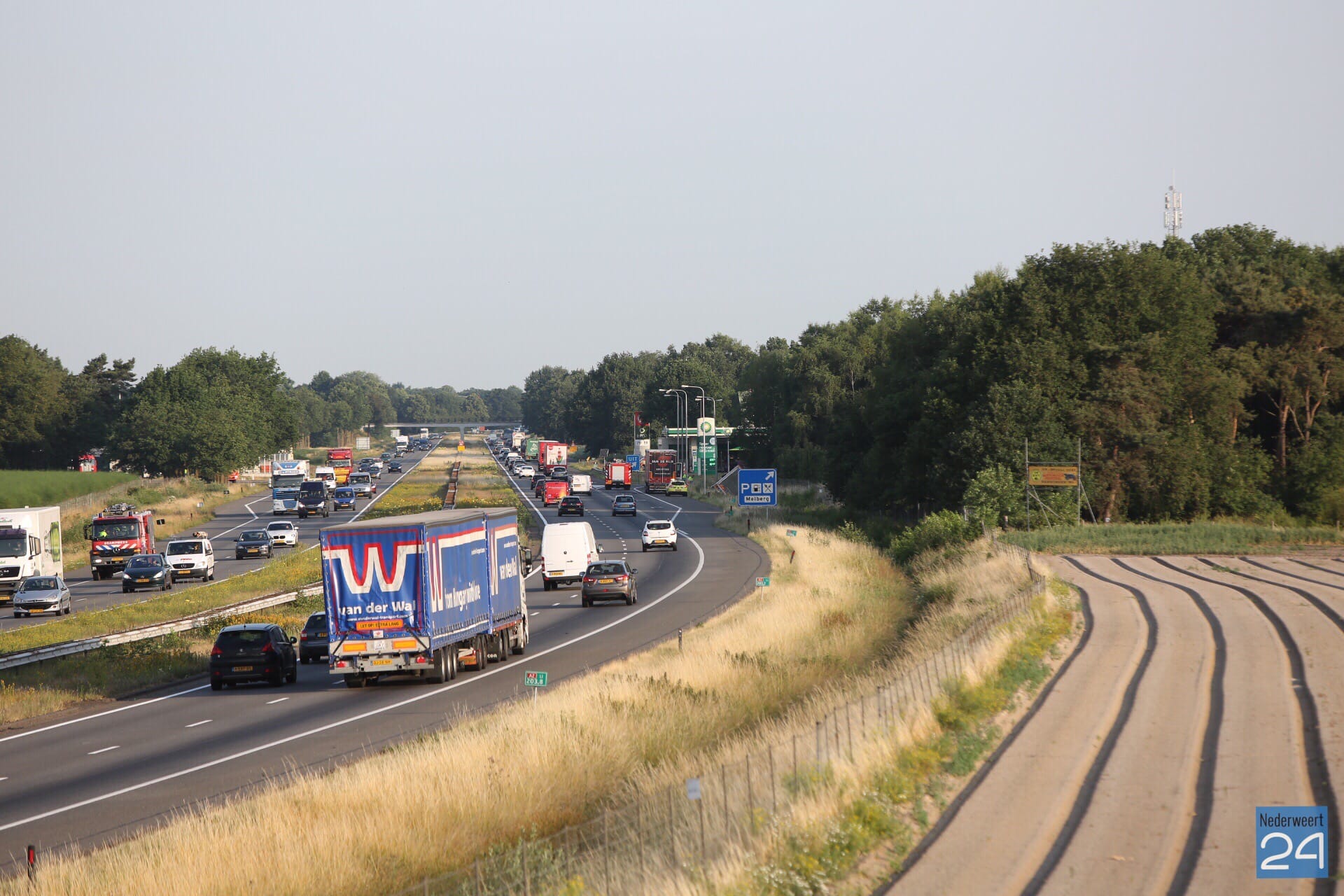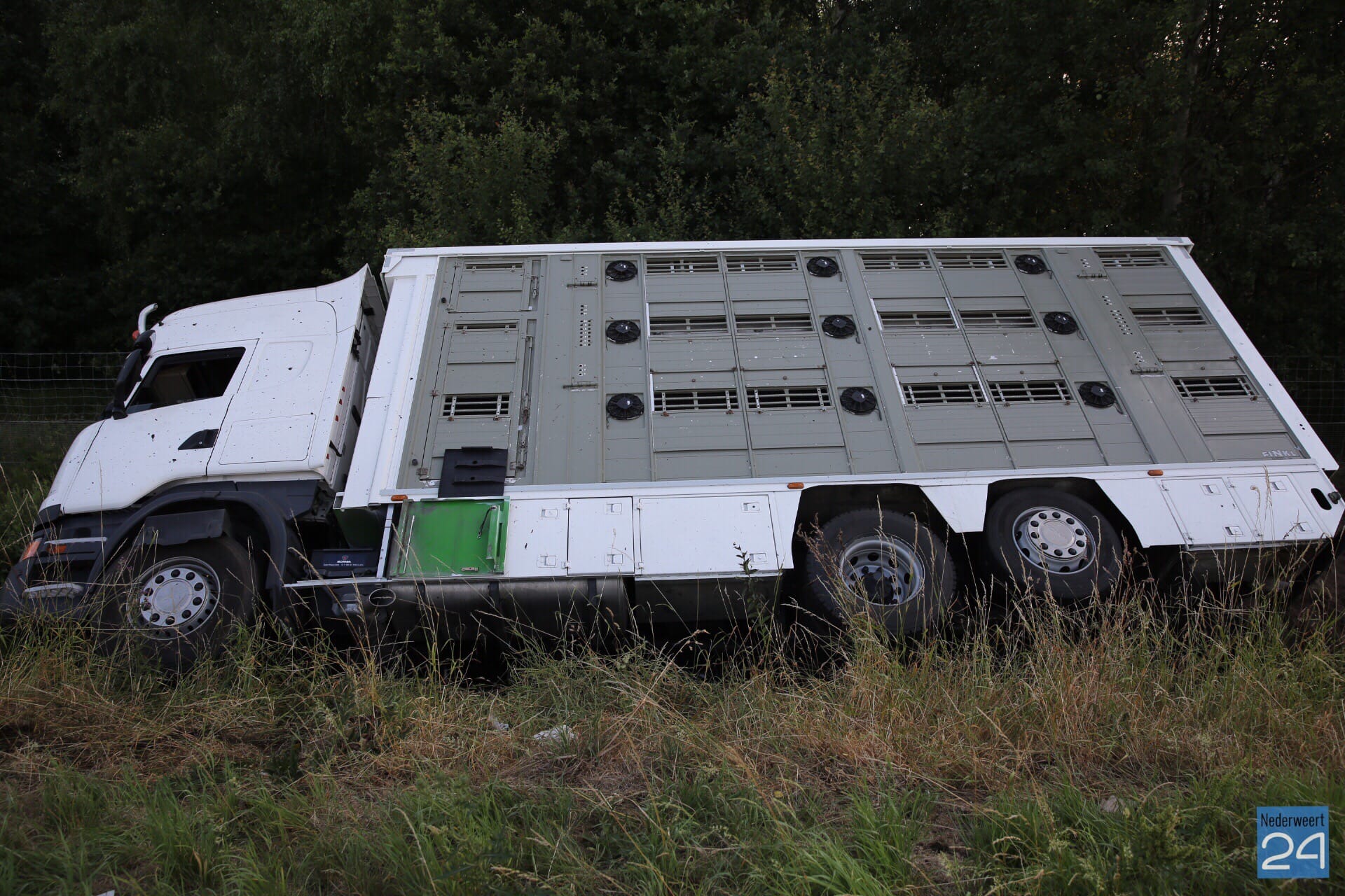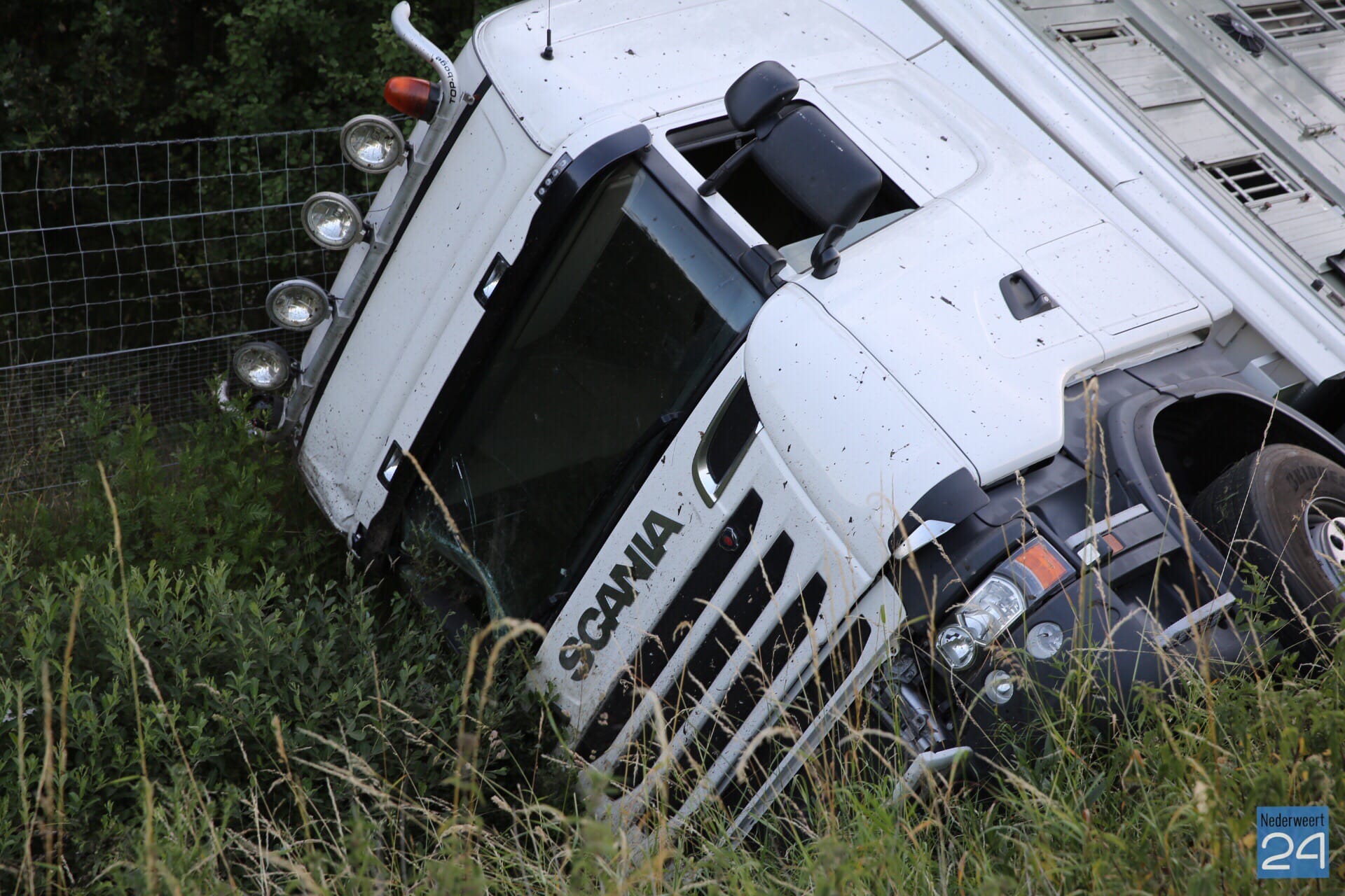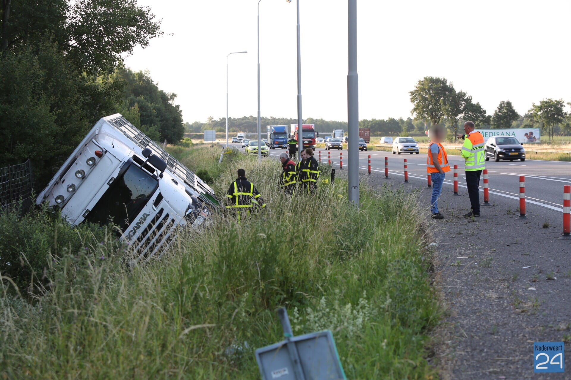 De chauffeur reed vanuit Kelpen-Oler richting Nederweert en heeft eerst een lantaarnpaal geraakt. Daarna is de vrachtwagen op zijn kant in de sloot tot stilstand gekomen. Het voertuig ligt bij de afrit naar de parkeerplaats/tankstation Meiberg.