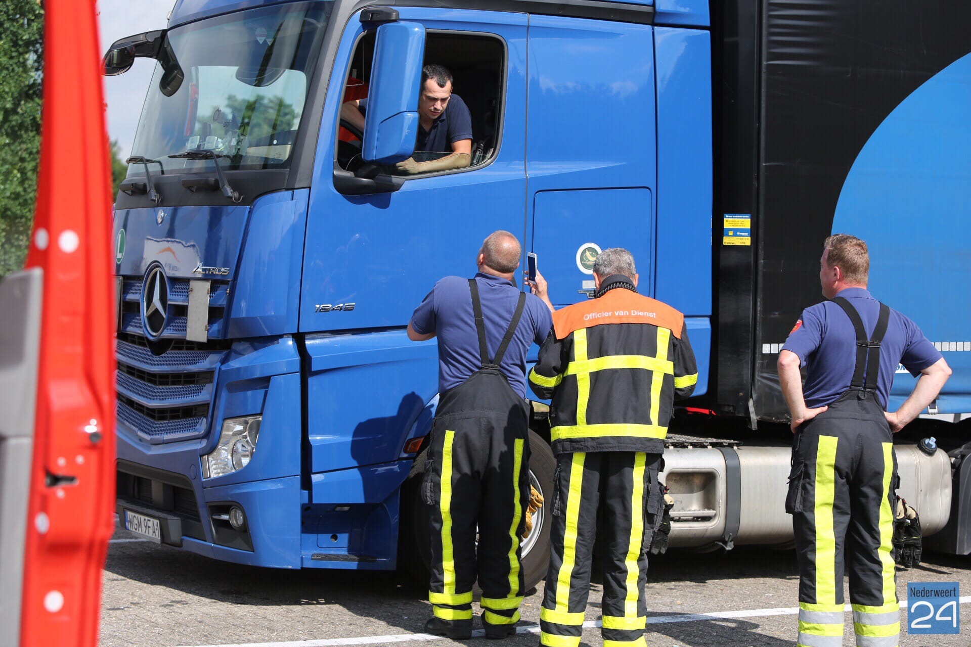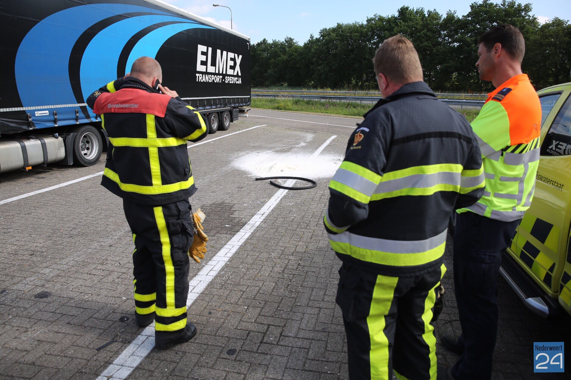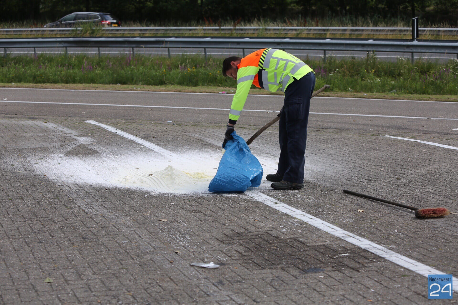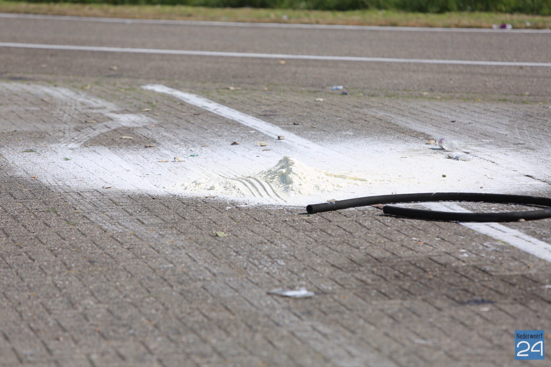 Navraag bij een andere vrachtwagenchauffeur leerde dat het zou gaan om ‘bloem’ dat van Engeland naar België zou worden vervoerd. De AGS is ter plaatse geweest en heeft voor de zekerheid met lakmoes de zuurtegraad van het poeder bepaald. Hieruit bleek dat geen gevaarlijke stof is. Rijkswaterstaat heeft de ‘bloem’ opgeruimd.