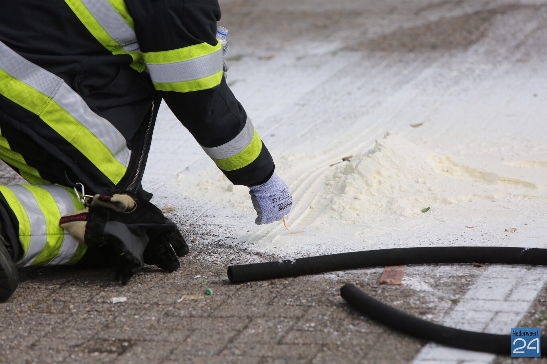 Op een parkeerplaats voor vrachtwagens lag een hoopje ‘onbekend’ wit poeder en een stuk slang. Het is niet bekend om wat voor goedje het gaat. De brandweer heeft de AGS (adviseur gevaarlijke stoffen) opgeroepen.