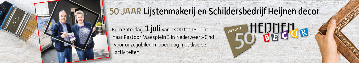 Op zaterdag 1 juli a.s. viert schildersbedrijf en lijstenmakerij Heijnen Decor uit Nederweert-Eind haar 50 jarig bestaansfeest. Na diverse aankondigingen van activiteiten is het bijna zover. Het belooft een mooie dag te worden met van alles voor jong en oud.