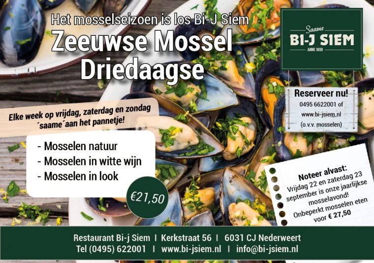 Ook deze de editie staat weer garant voor “saame” gezellig tafelen en ‘saame’ genieten. Dus noteer alvast deze data of reserveer nu al via 0495 – 622 001 of via www.bi-jsiem.nl of info@bi-jsiem.nl Wees op tijd, want vol is vol. Wij maken er ‘saame’ een mooi mosselseizoen van!