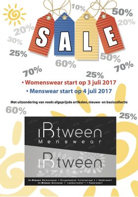 Bij In-Btween Womenswear en In-Btween Menswear in Nederweert start deze week een SALE met fantastische kortingen. Womenswear start op maandag 3 juli 2017 en Menswear start op dinsdag 4 juli.