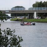 Naast agenten met honden is ook het oppervlakte reddingsteam van de brandweer in het water aan het zoeken. Vanaf de kant bekijkt de brandweer de omgeving met een warmtebeeldcamera.