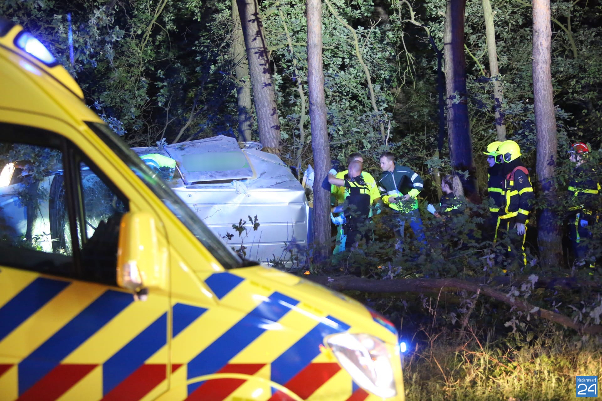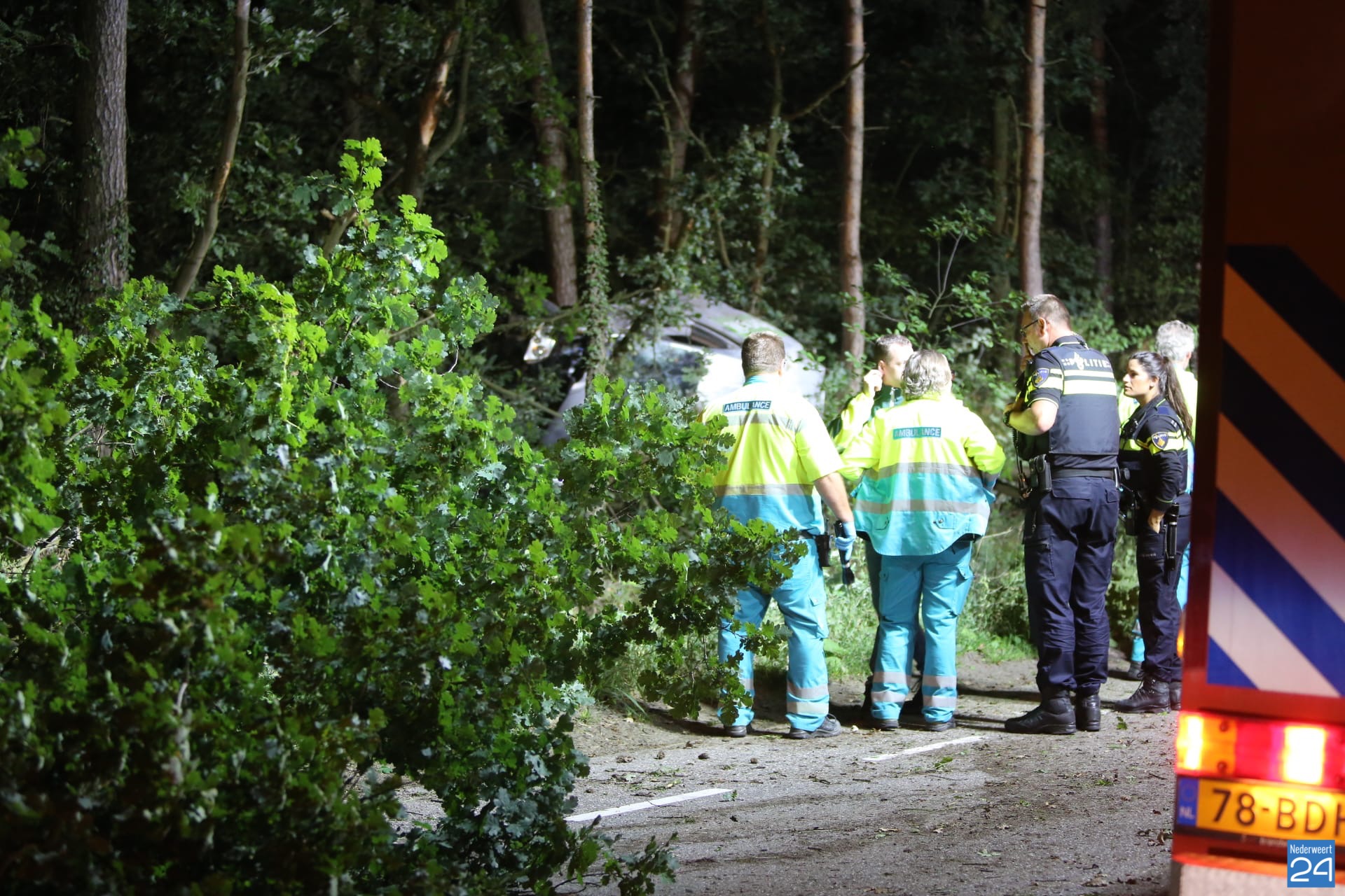 Een voorbijganger zag een stuk van de boom op de weg liggen. Hij stopte en zag toen de auto in de struiken liggen. ‘Ik heb direct de hulpdiensten gewaarschuwd, politie, brandweer en ambulance,’ aldus de melder.