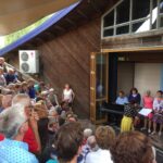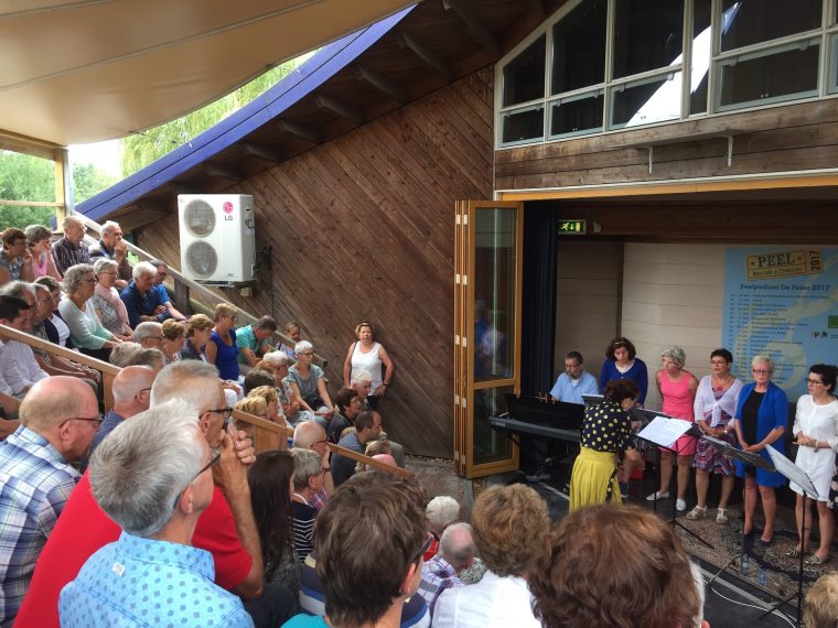Gastvrouw Marijke Vaes van Buitencentrum ‘De Pelen’ zag tevreden toe toen zondagmiddag het sfeervolle amfitheater weer helemaal gevuld was. In het programma ‘Peelpodium 2017: Muziek & Theater in De Groote Peel’ was het ditmaal de beurt aan het dameskoor ZusenZo. Deze zanggroep bestaat uit de gezusters Peeters (‘zus’) en aanhang van de familie (‘zo’) en bracht een gevarieerd repertoir aan prettig klinkende nummers.