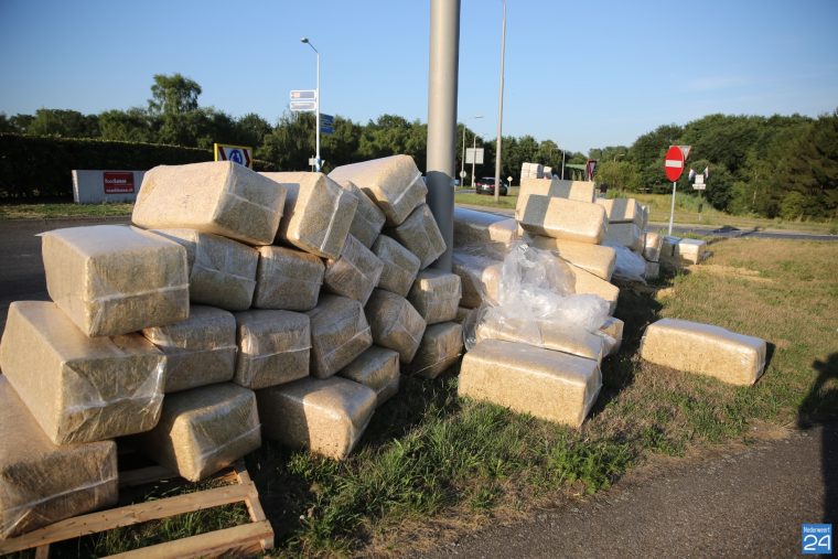 Met hangen en wurgen heeft de chauffeur zijn vrachtwagen met aanhanger nog een stukje vooruit kunnen rijden zodat het verkeer door kon stromen. Een voorbijganger heeft geholpen om de pakken stro die op de weg lagen, op te ruimen.