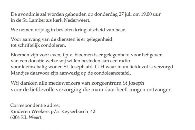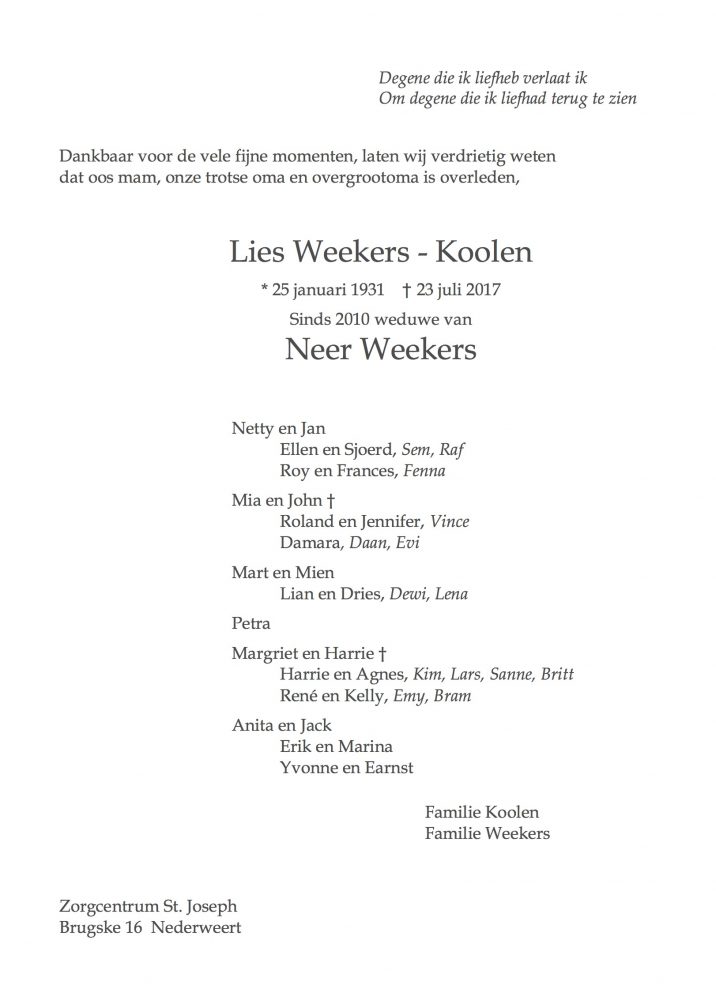 Overlijdensbericht: Lies Weekers – Koolen