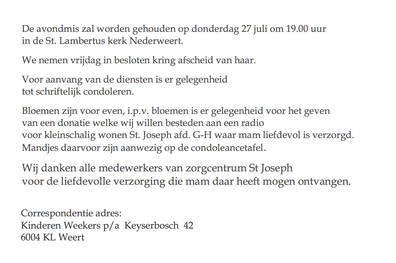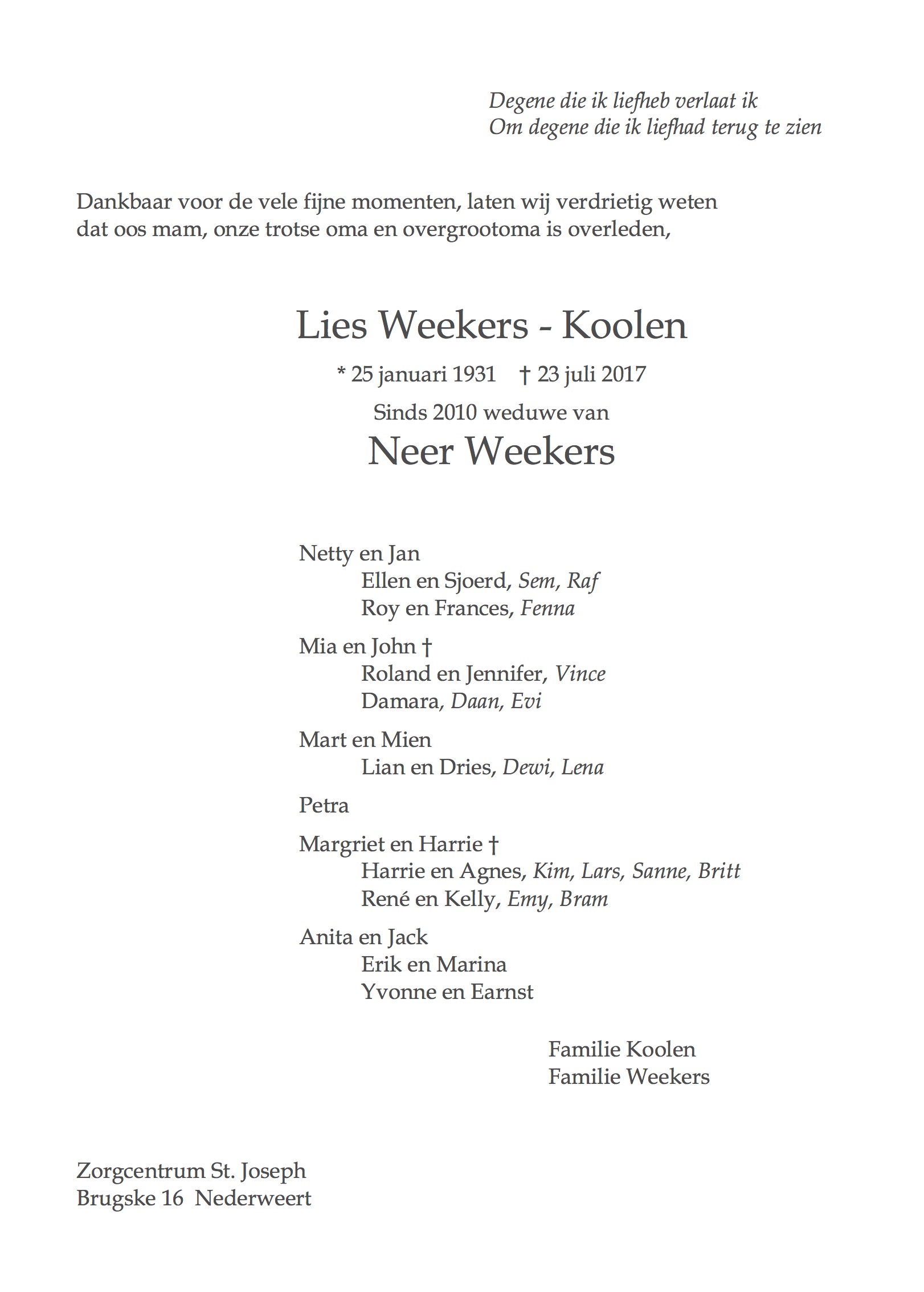 Overlijdensbericht: Lies Weekers – Koolen