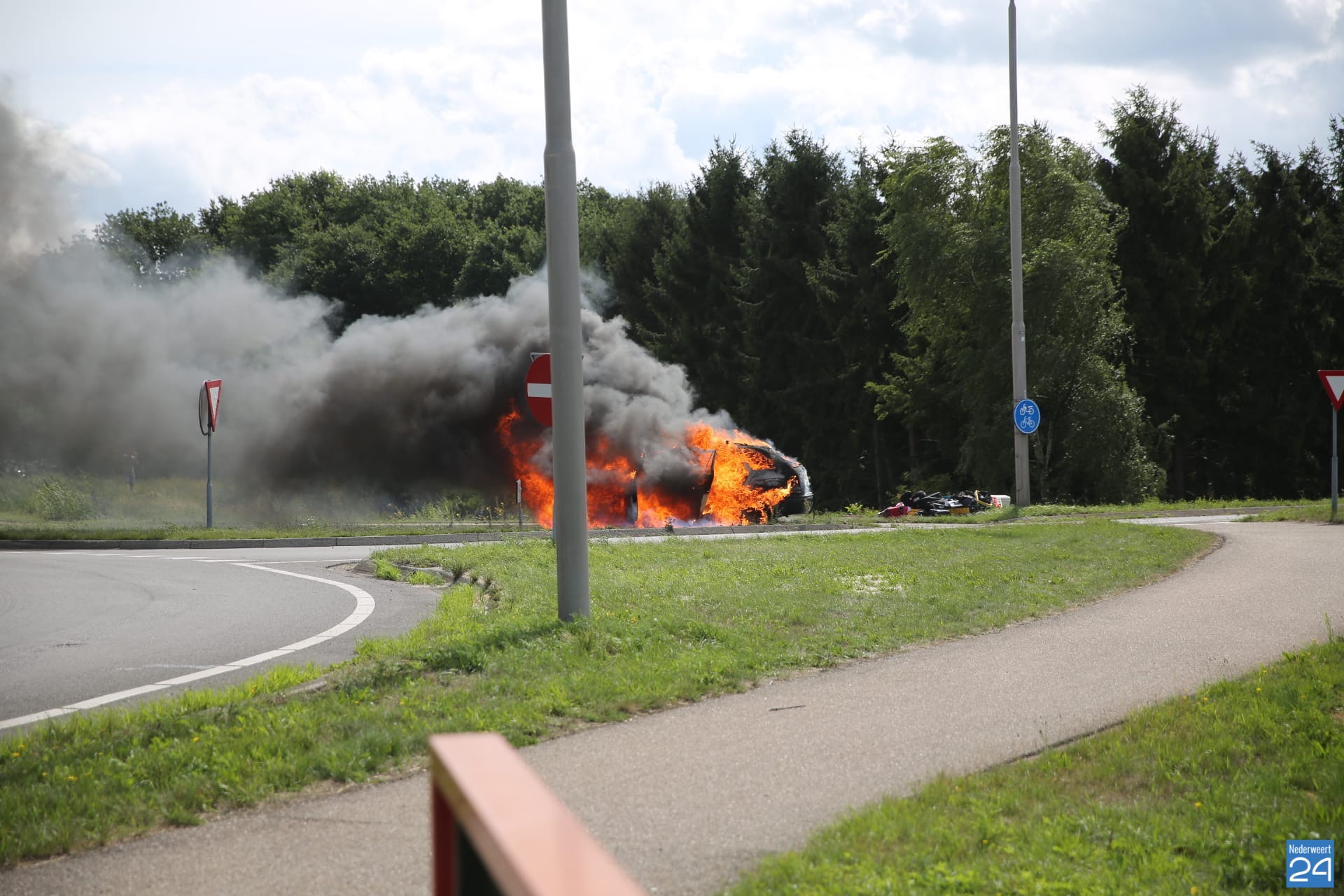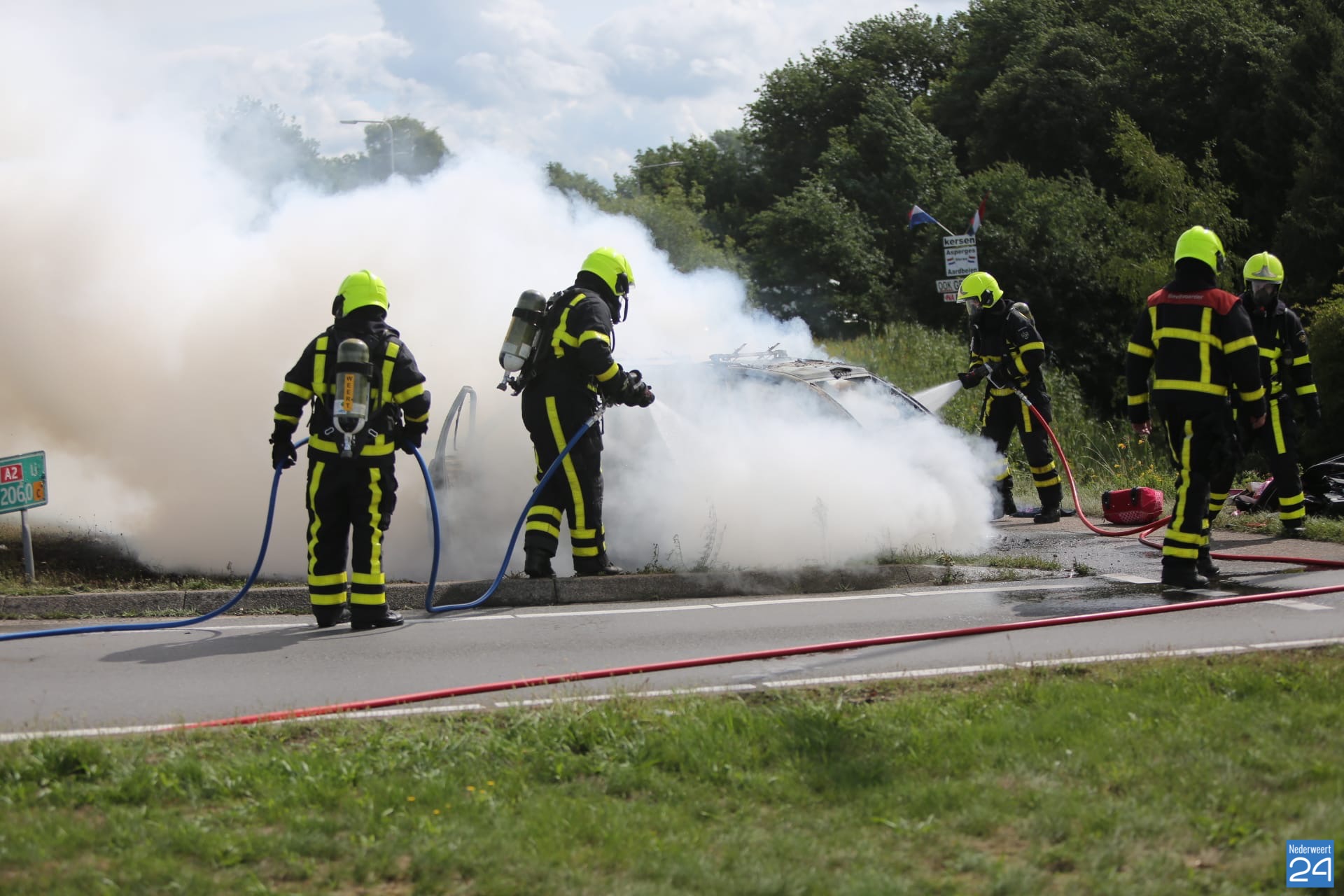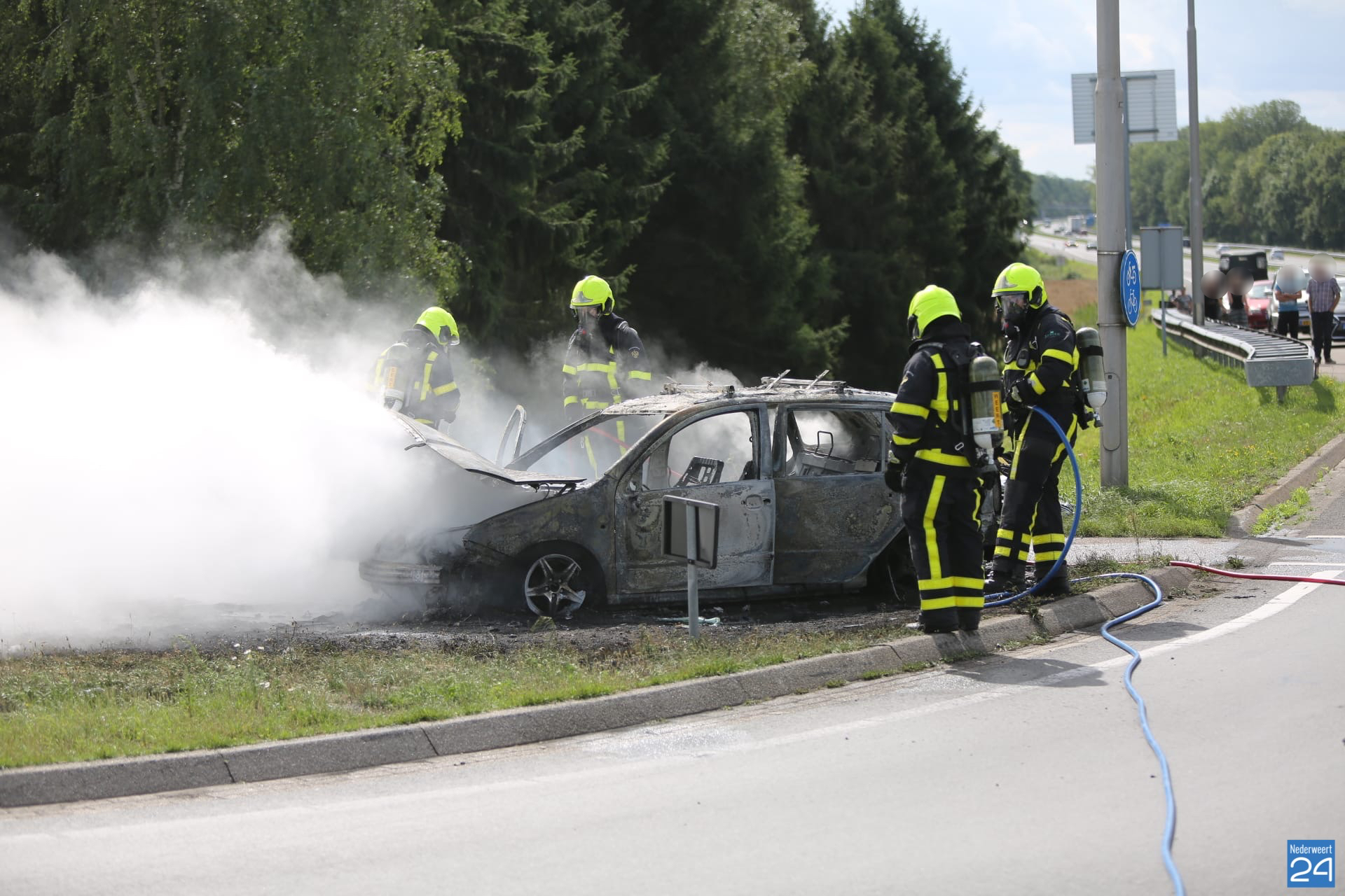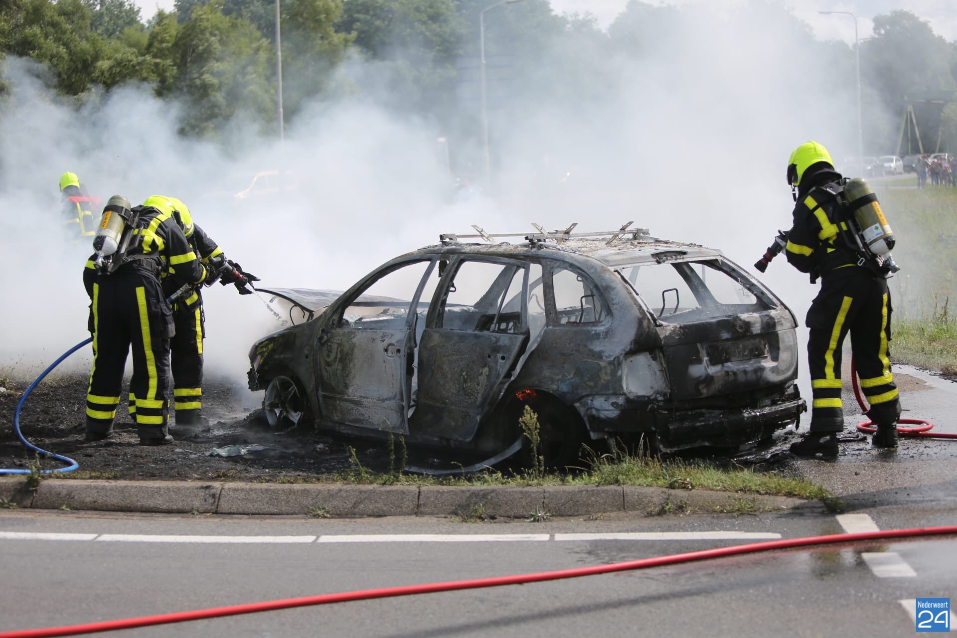 De brandweer van Weert en Grathem was snel ter plaatse en heeft het vuur geblust. Van de auto bleef niet meer over dan het stalen karkas.