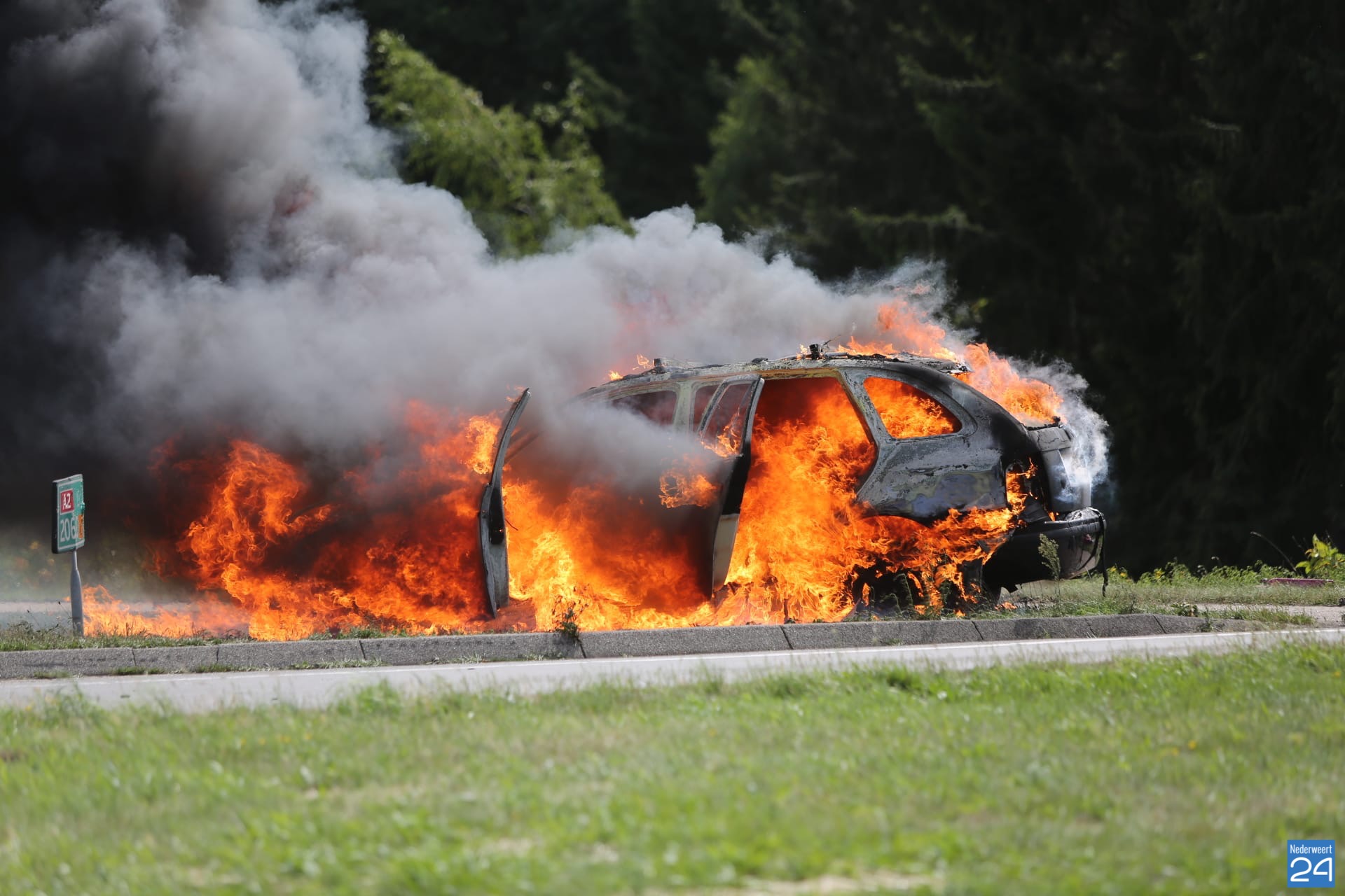 De inzittenden reden op de snelweg en waren onderweg naar hun vakantieadres toen ze rook onder de motorkap zagen uitkomen. De bestuurder heeft de auto bovenaan bij de rotonde in de berm gezet en de inzittenden hebben nog gauw hun persoonlijke bezittingen uit de auto kunnen halen voordat de auto volledig in vlammen op ging.