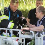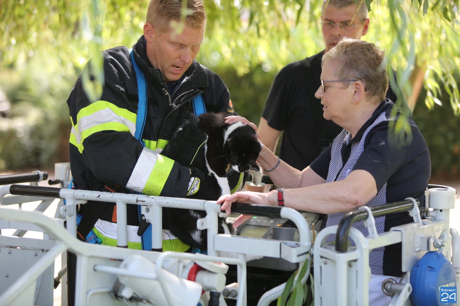 De brandweer werd gebeld en toen deze met de ladderwagen bijna bij de kat was, klom het dier nog hoger. Haar baasje ging mee in de korf en wist uiteindelijk de kat te pakken. Eenmaal beneden rende ze naar huis. De brandweerman kreeg als dank een kusje.  Het diertje maakt het naar omstandigheden goed.
