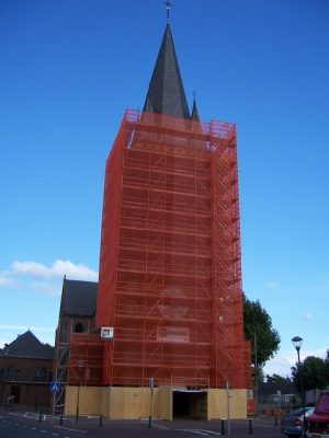 De Ospelse kerktoren is omhangen door een oranje net rond het steiger, klaar voor de restauratie die na de bouwvakvakantie start.