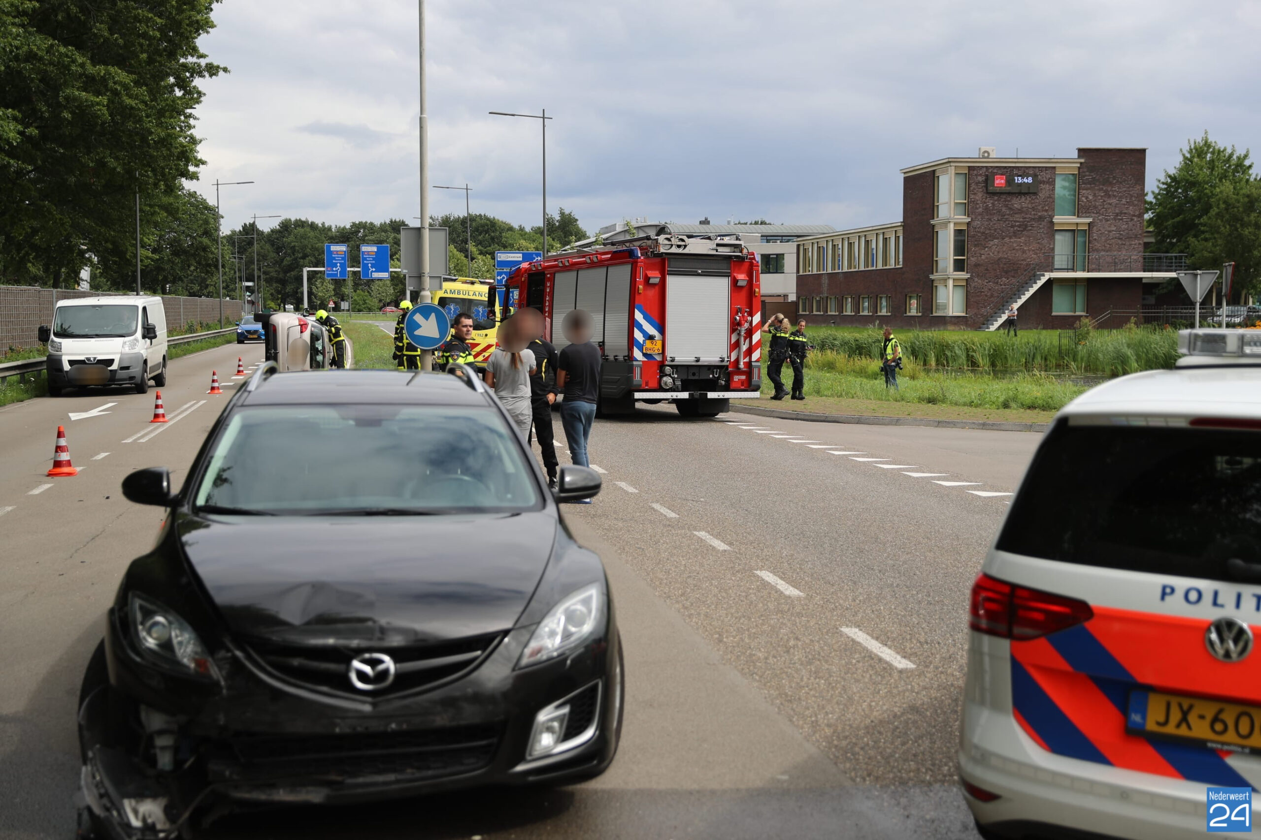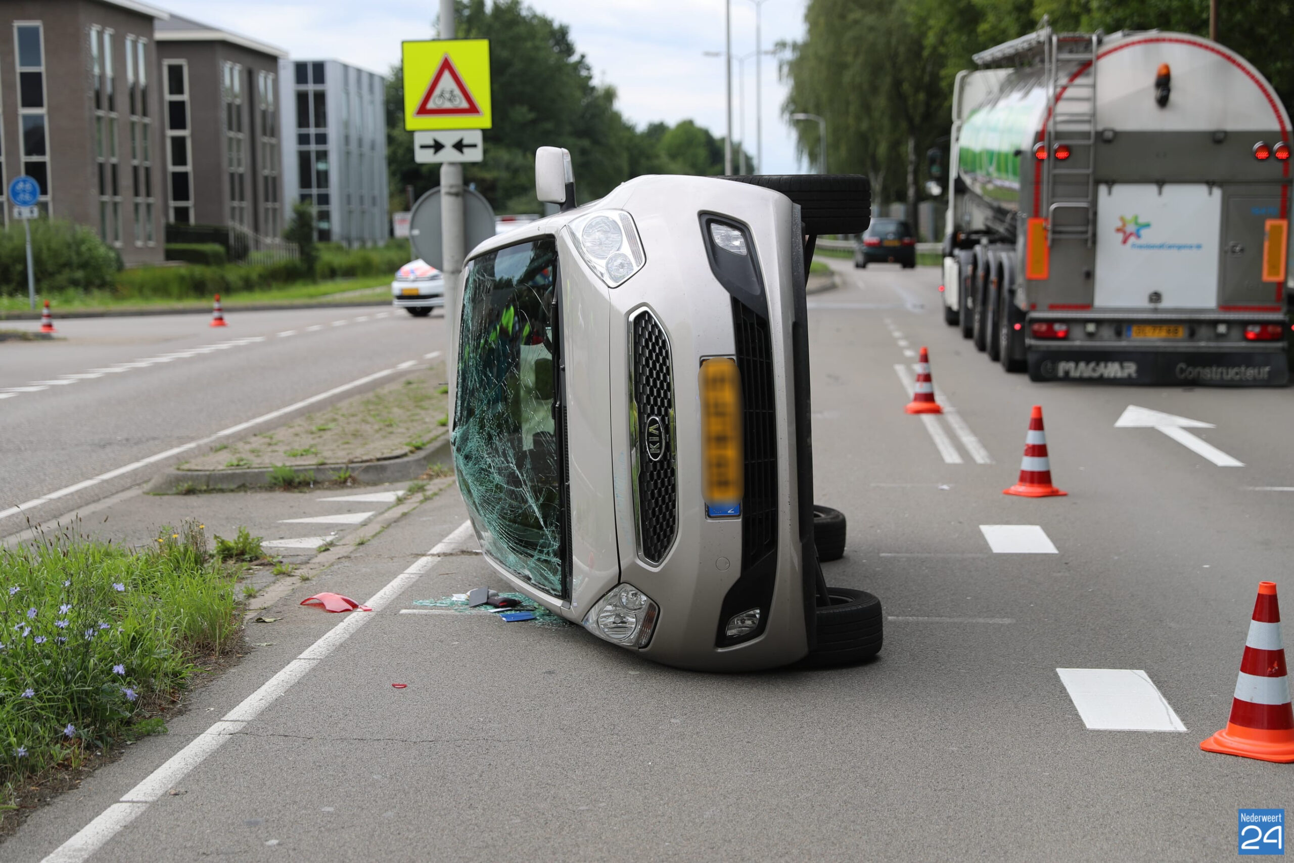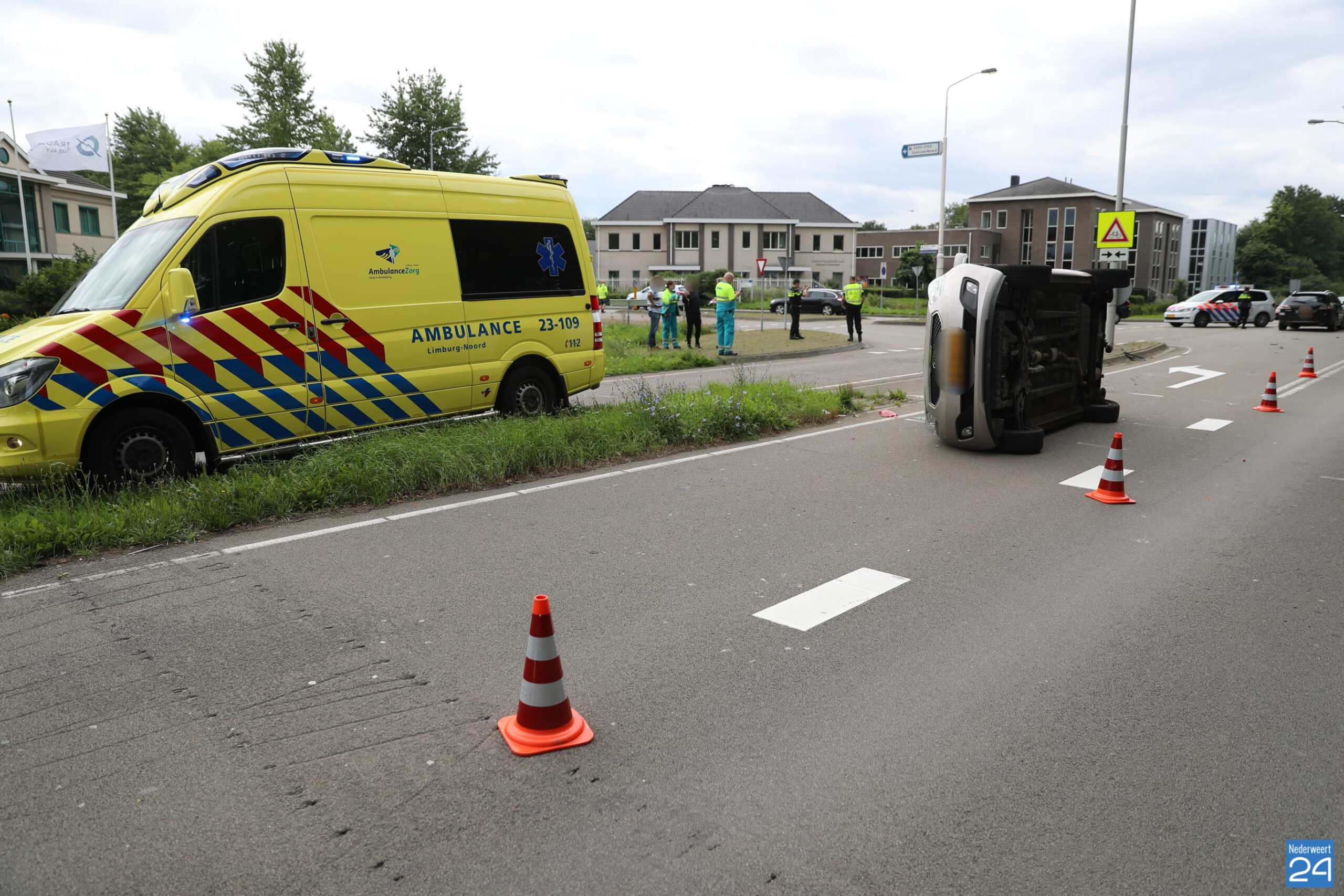 Bij een botsing in Weert is zaterdagmiddag een auto op zijn kant terechtgekomen. Het ongeval gebeurde op de T-splitsing Ringbaan Noord en Gouverneurlaan in Weert.