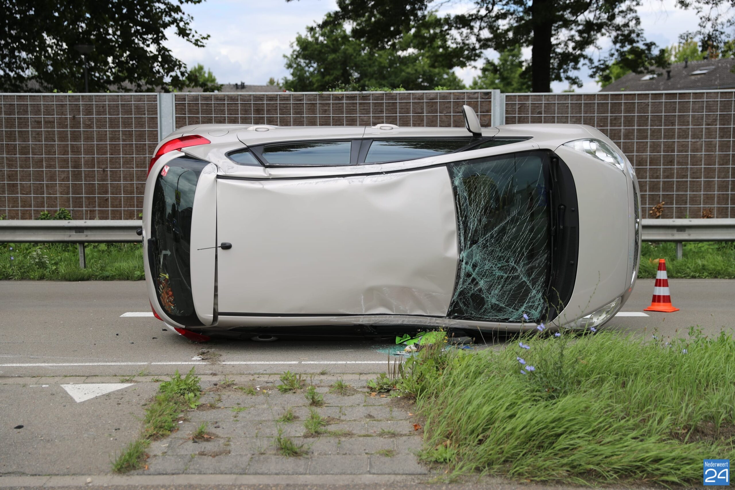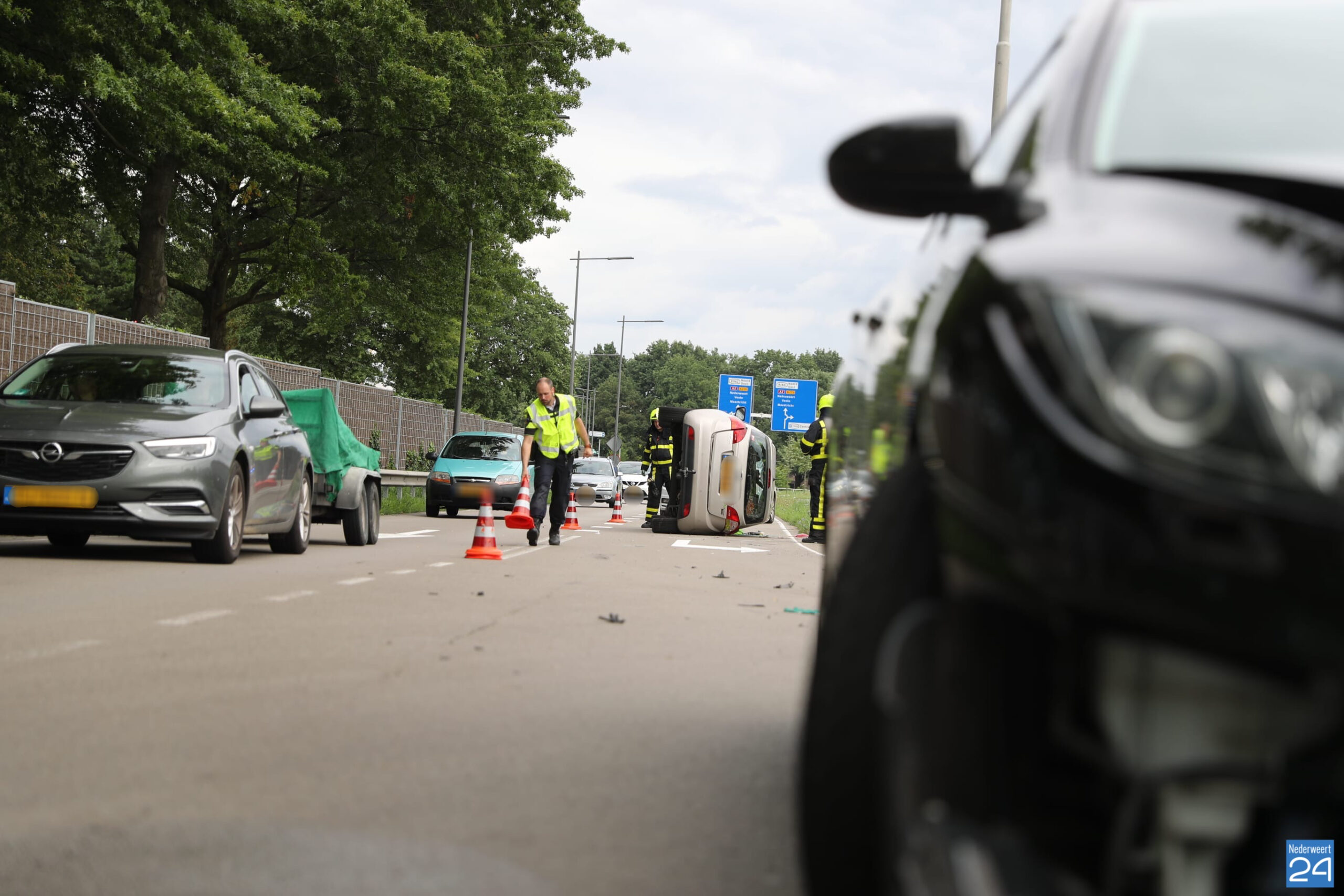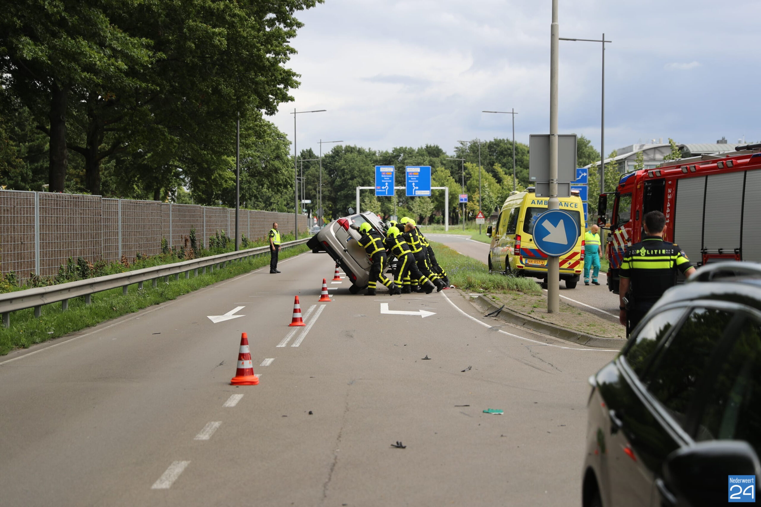 Bij een botsing in Weert is zaterdagmiddag een auto op zijn kant terechtgekomen. Het ongeval gebeurde op de T-splitsing Ringbaan Noord en Gouverneurlaan in Weert.