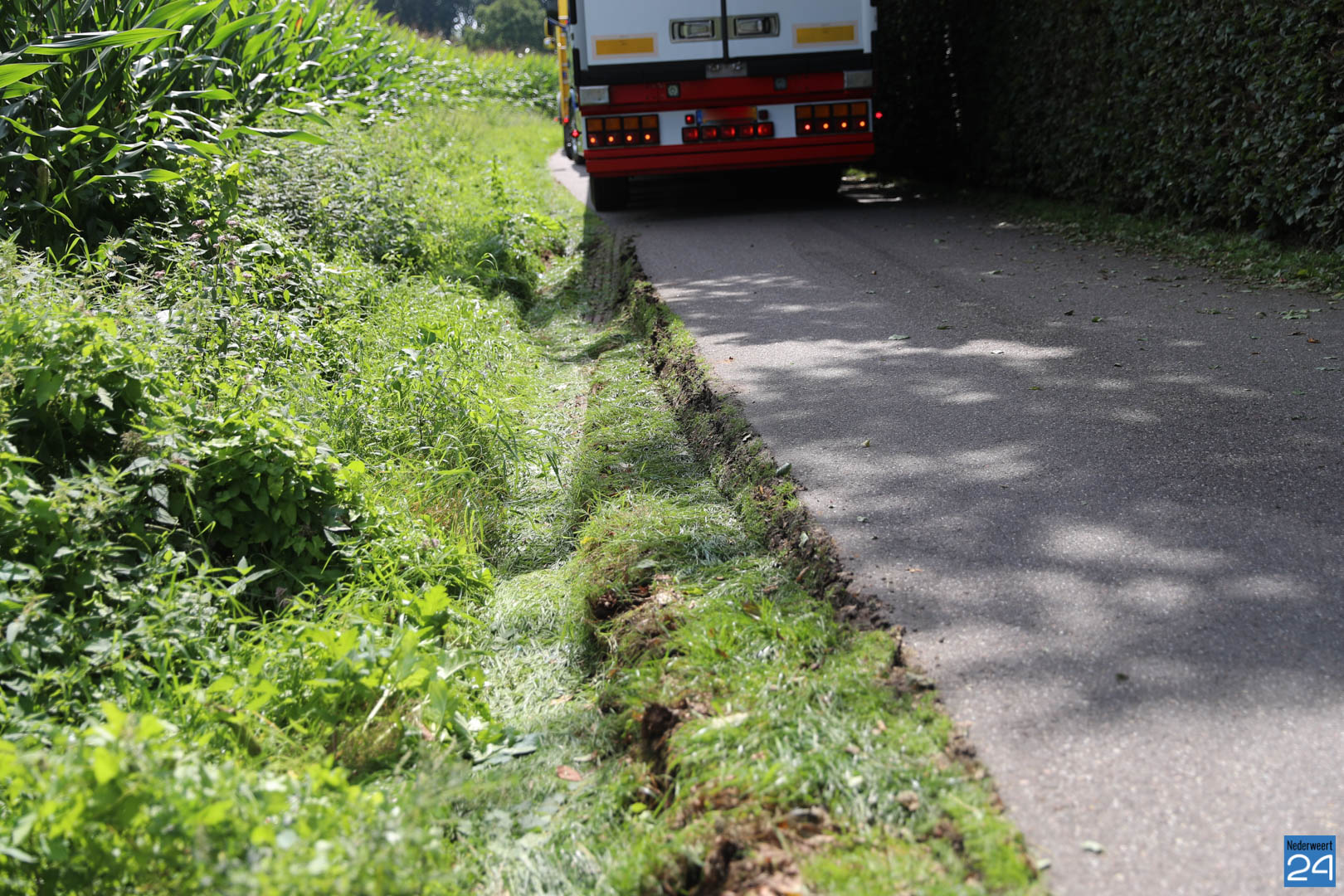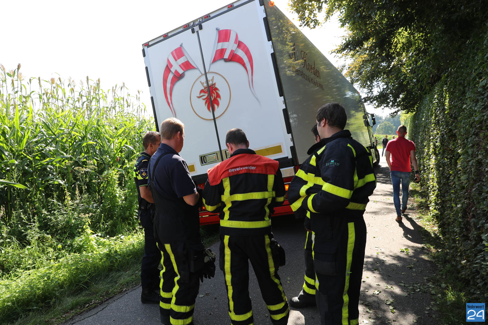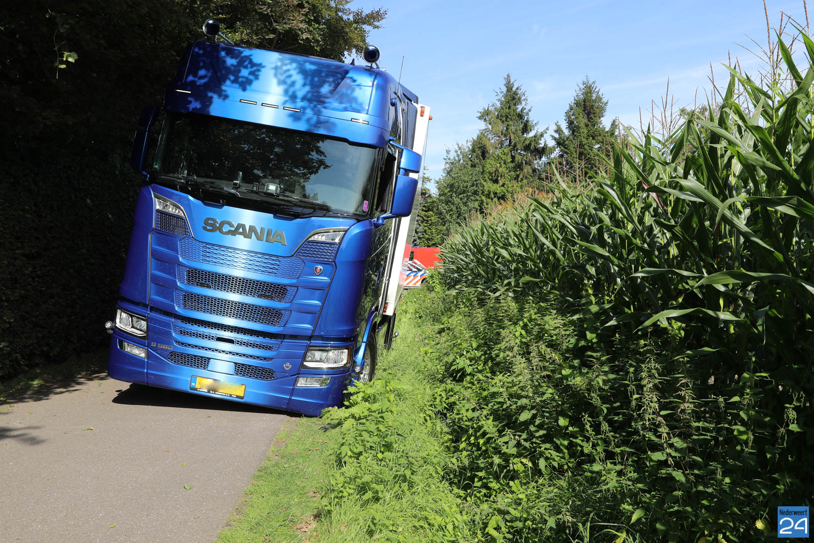 De vrachtwagen was onderweg naar het distributiecentrum van de Lidl. Volgens de TomTom was dit de kortste weg, maar een klein tunneltje onder het spoor door versperde de weg en moest de chauffeur een flink stuk achteruit rijden. Omdat op het laatste stuk wat takken over de weg hingen, wilde hij uitwijken met als gevolg dat zijn wielen langs het asfalt kwamen en wegzakten.