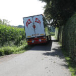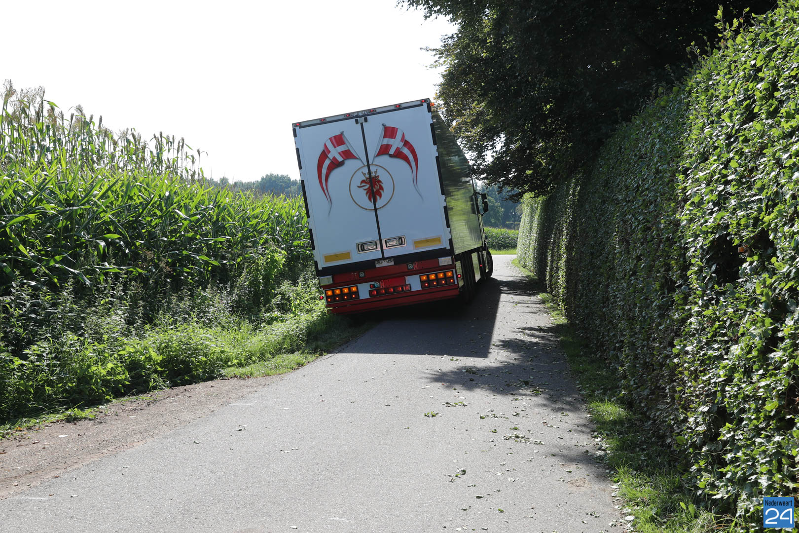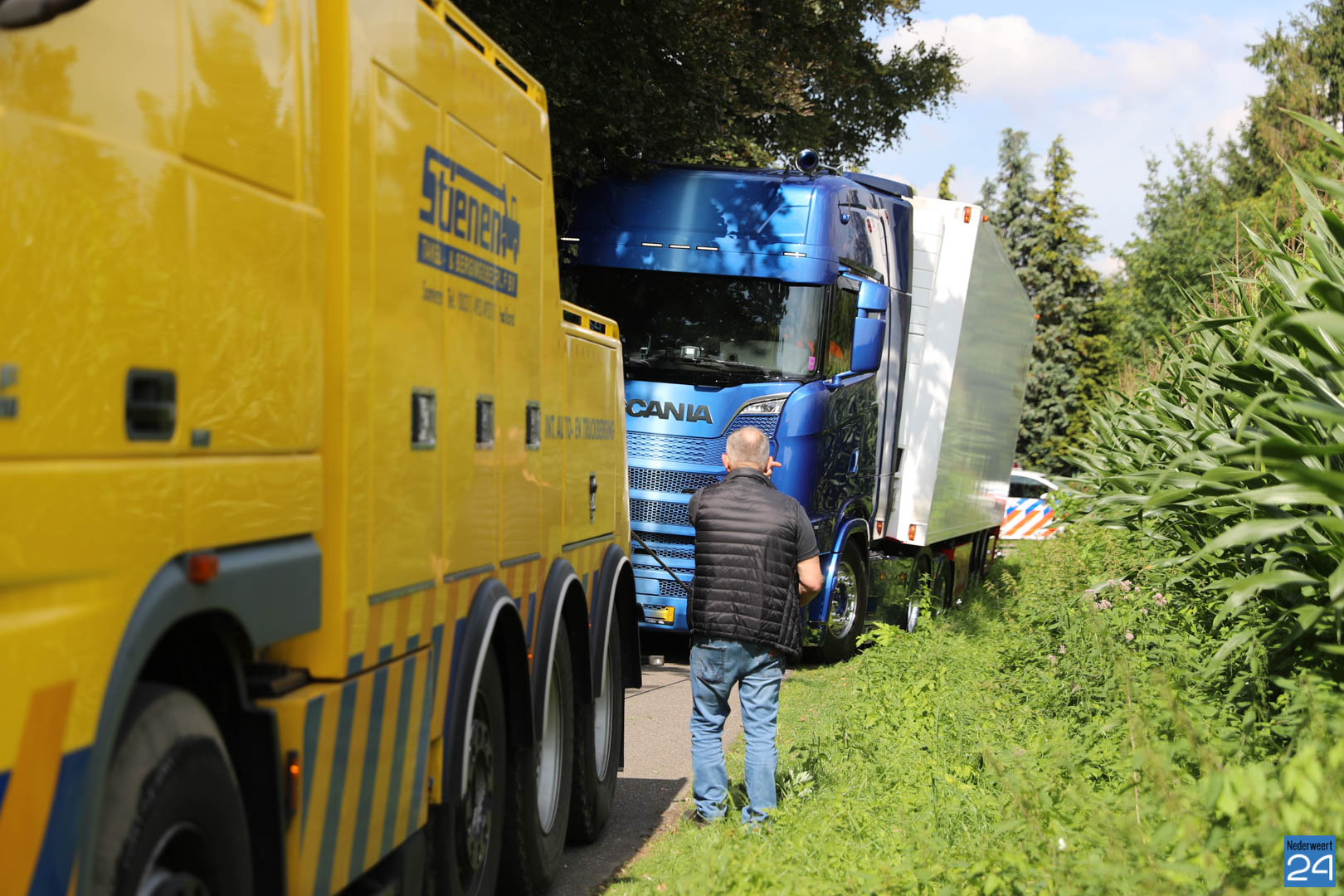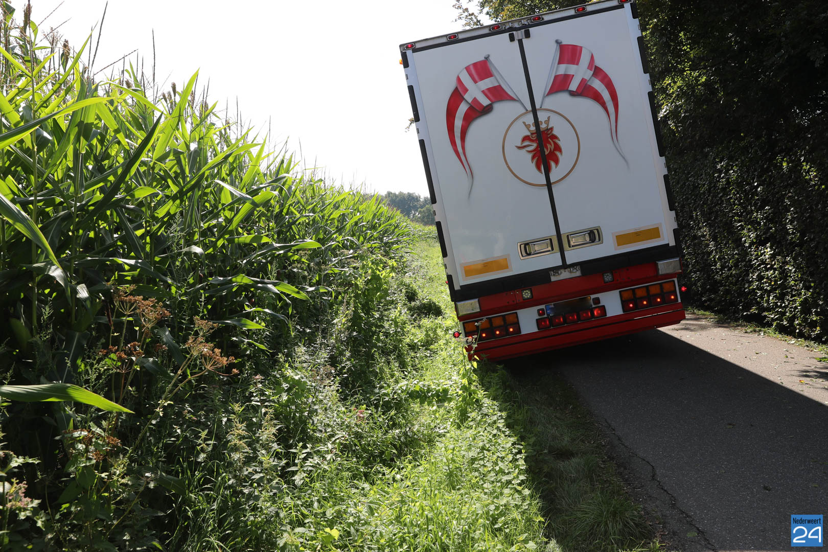 De vrachtwagen was onderweg naar het distributiecentrum van de Lidl. Volgens de TomTom was dit de kortste weg, maar een klein tunneltje onder het spoor door versperde de weg en moest de chauffeur een flink stuk achteruit rijden. Omdat op het laatste stuk wat takken over de weg hingen, wilde hij uitwijken met als gevolg dat zijn wielen langs het asfalt kwamen en wegzakten.