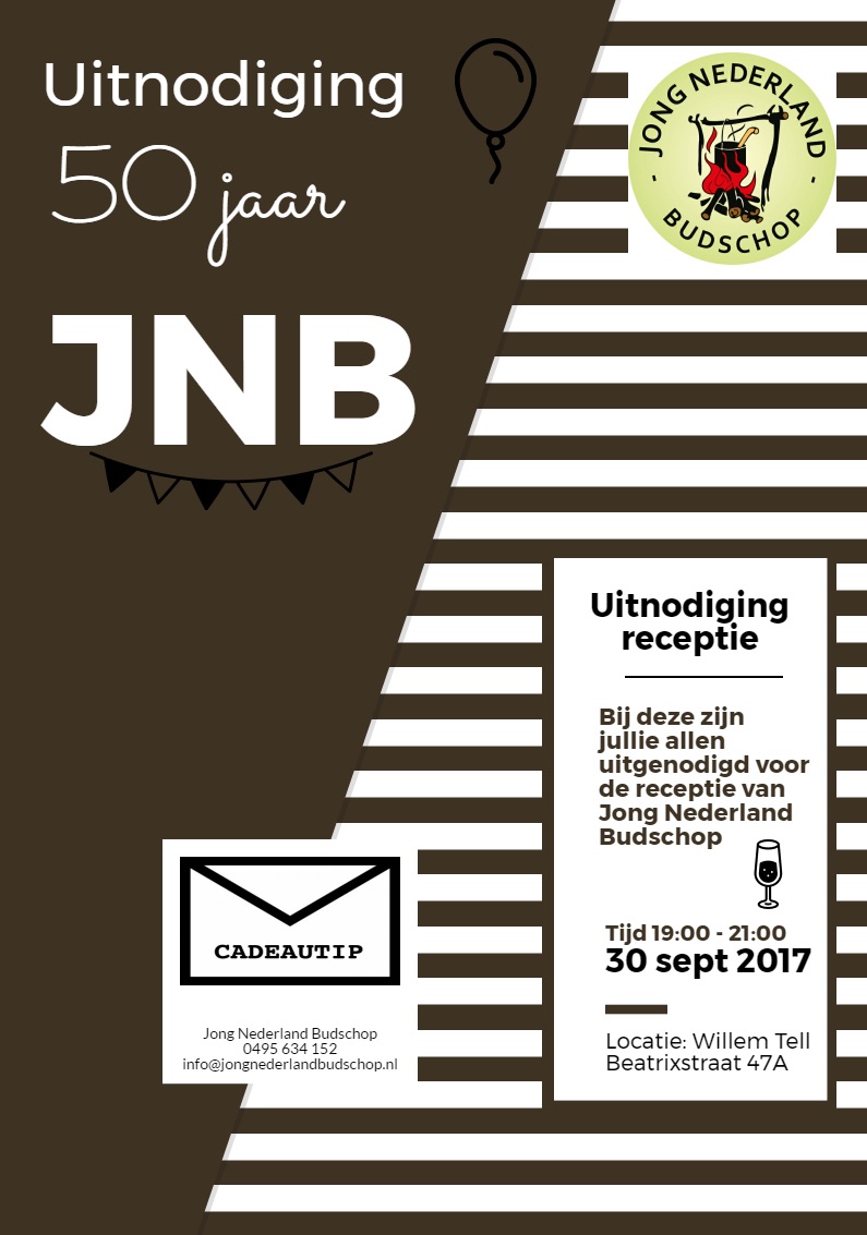 Met trots kan er dan ook gezegd worden dat Jong Nederland Budschop al (bijna) 50 jaar een geweldige ervaring voor jong en oud is. En juist daar wil de vereniging bij stil staan. Zaterdag 30 september 2017, precies 50 jaar later, wordt dit heuglijke feit gevierd met een receptie bij Willem Tell a/d Beatrixstraat 47a in Nederweert in Budschop waar iedereen van harte voor is uitgenodigd. De receptie vindt plaats tussen 19.00 en 21.00.