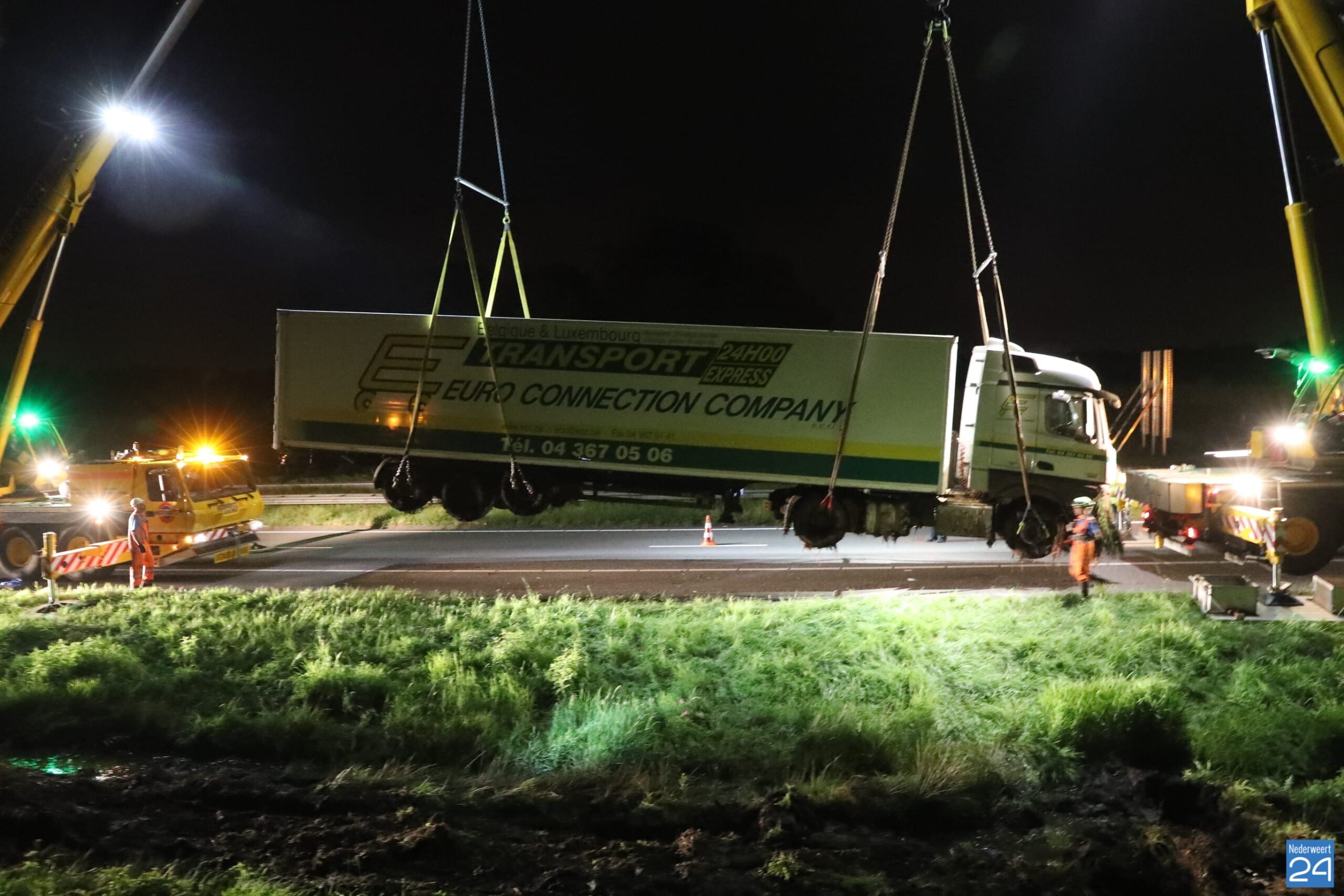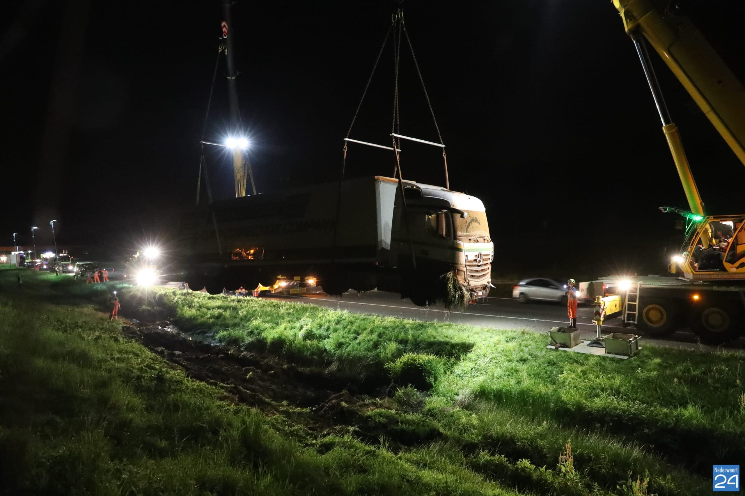 De berger is inmiddels met grote hijskranen ter plaatse om het gevaarte uit de sloot te takelen. Een rijbaan is tijdelijk afgesloten, maar gezien het tijdstip van de berging heeft het verkeer hier weinig hinder van.