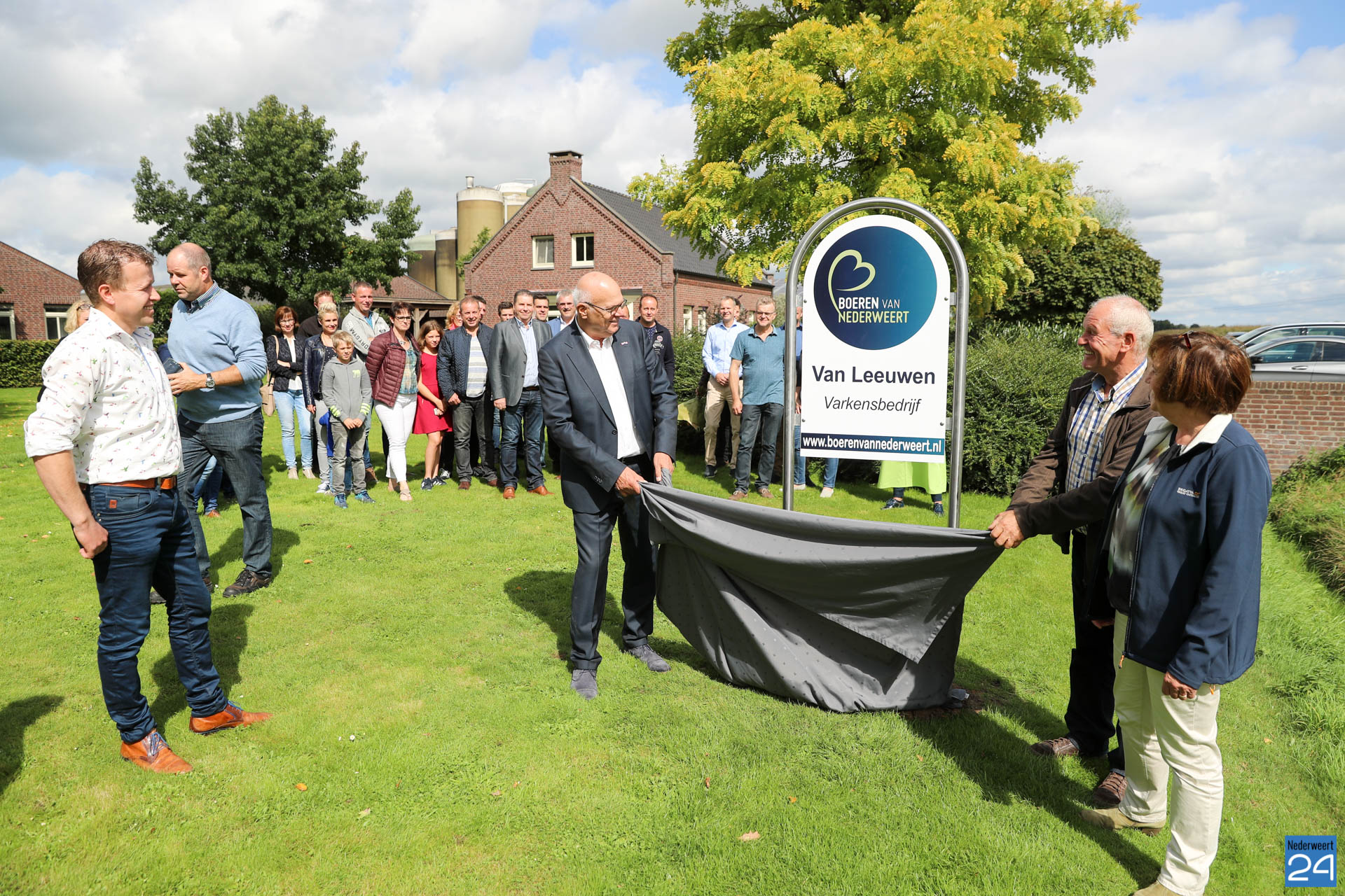 Burgmeester Evers heeft vandaag het eerste bord van Boeren van Nederweert onthuld. De eer viel te beurt aan de familie van Leeuwen van ‘ons boerenerf’ aan de Banendijk in Nederweert-Eind. Om de betrokkenheid van de boeren in de gemeenschap te benadrukken werd ‘ons boerenerf’ uitgekozen om als eerste dit bord te plaatsten. Dit gebeurt in het weekend van “Fladderen door Nederweert” waar het bedrijf van Aad maar ook andere boeren aan deelnemen.