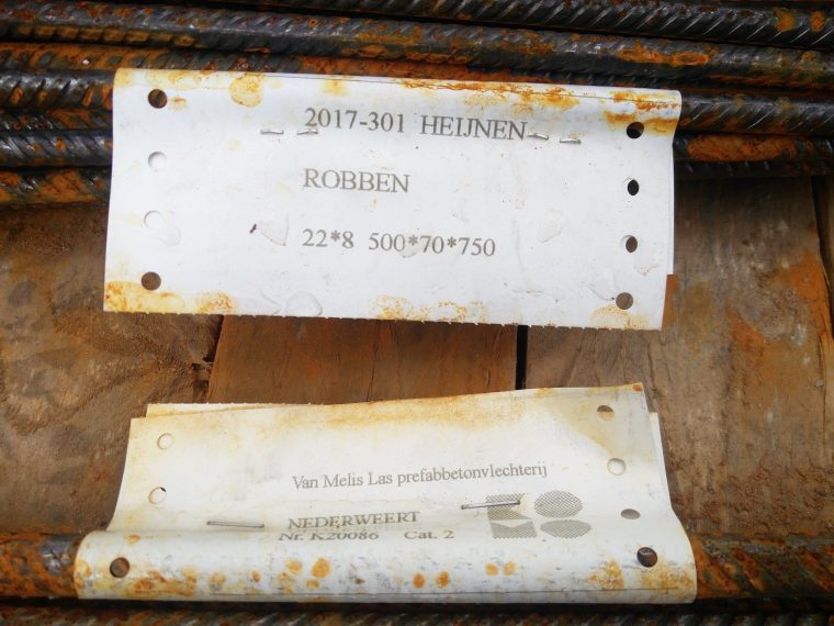 De pallet stond in het weiland klaar voor transport naar verschillende werken. Alle staven waren netjes gebundeld en gelabeld per werk en soort.