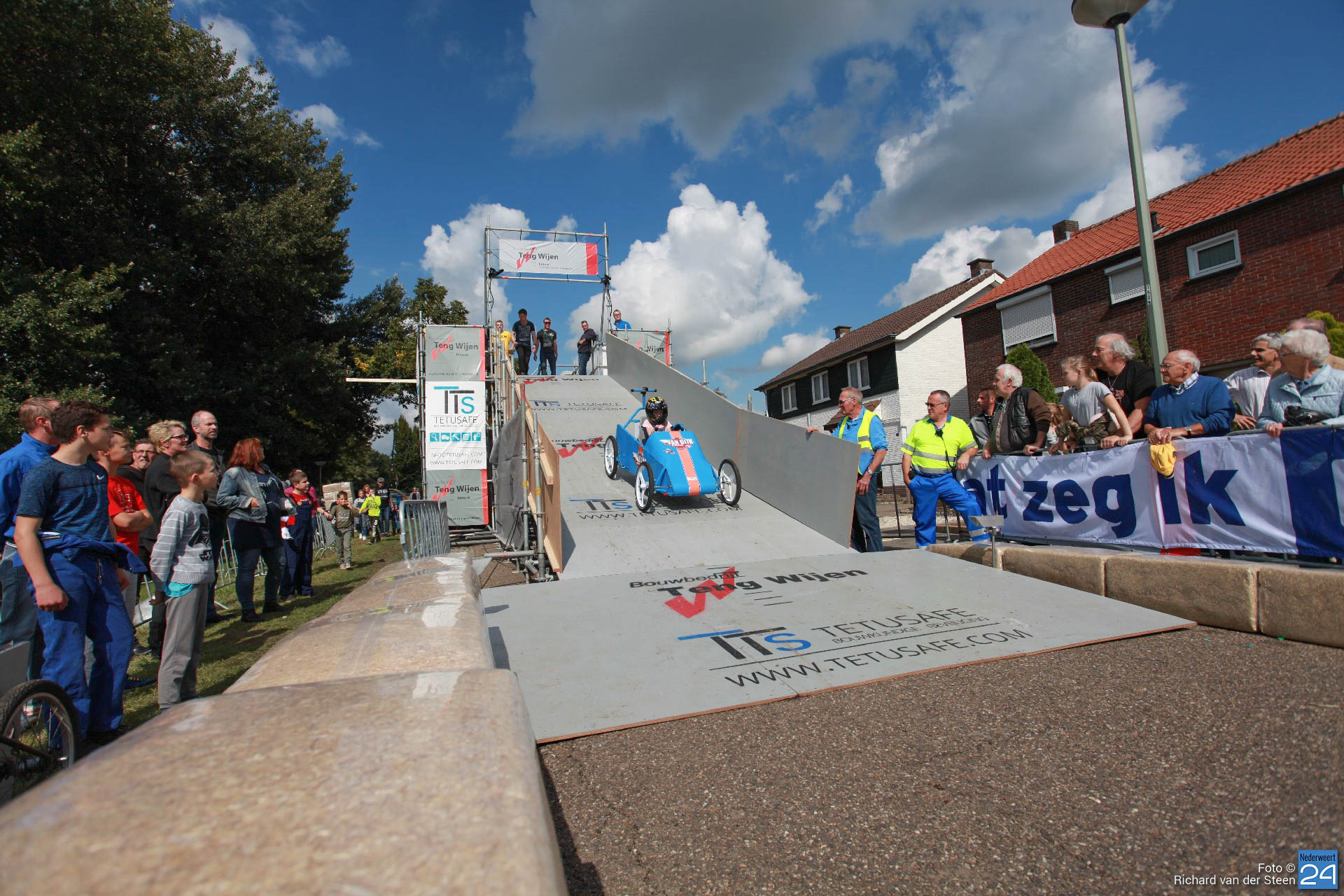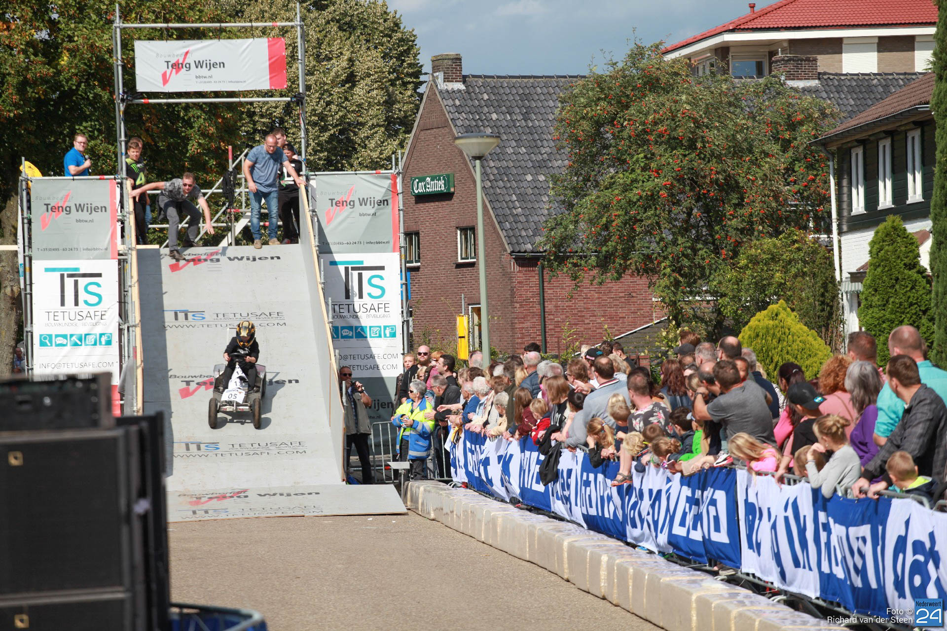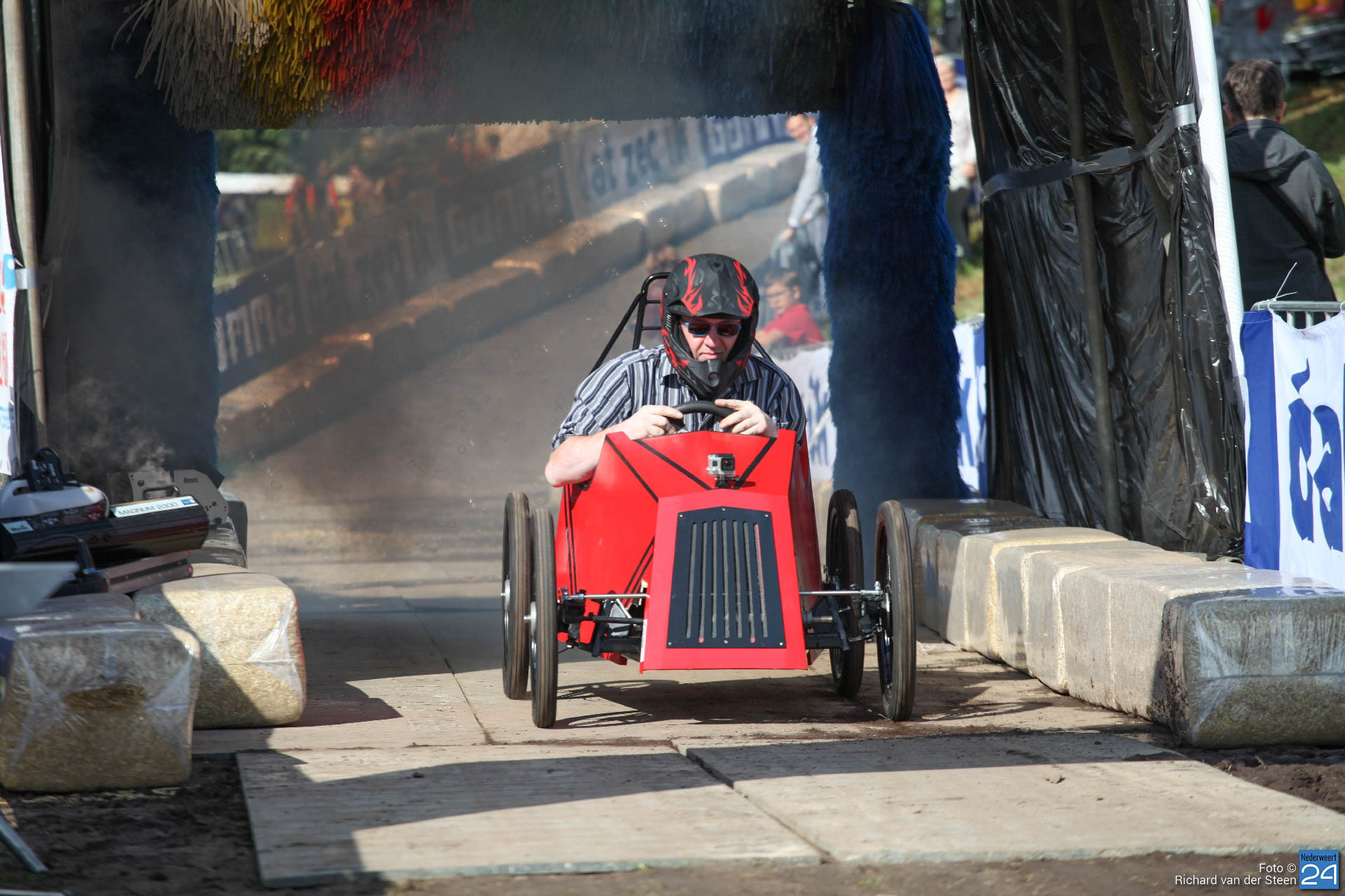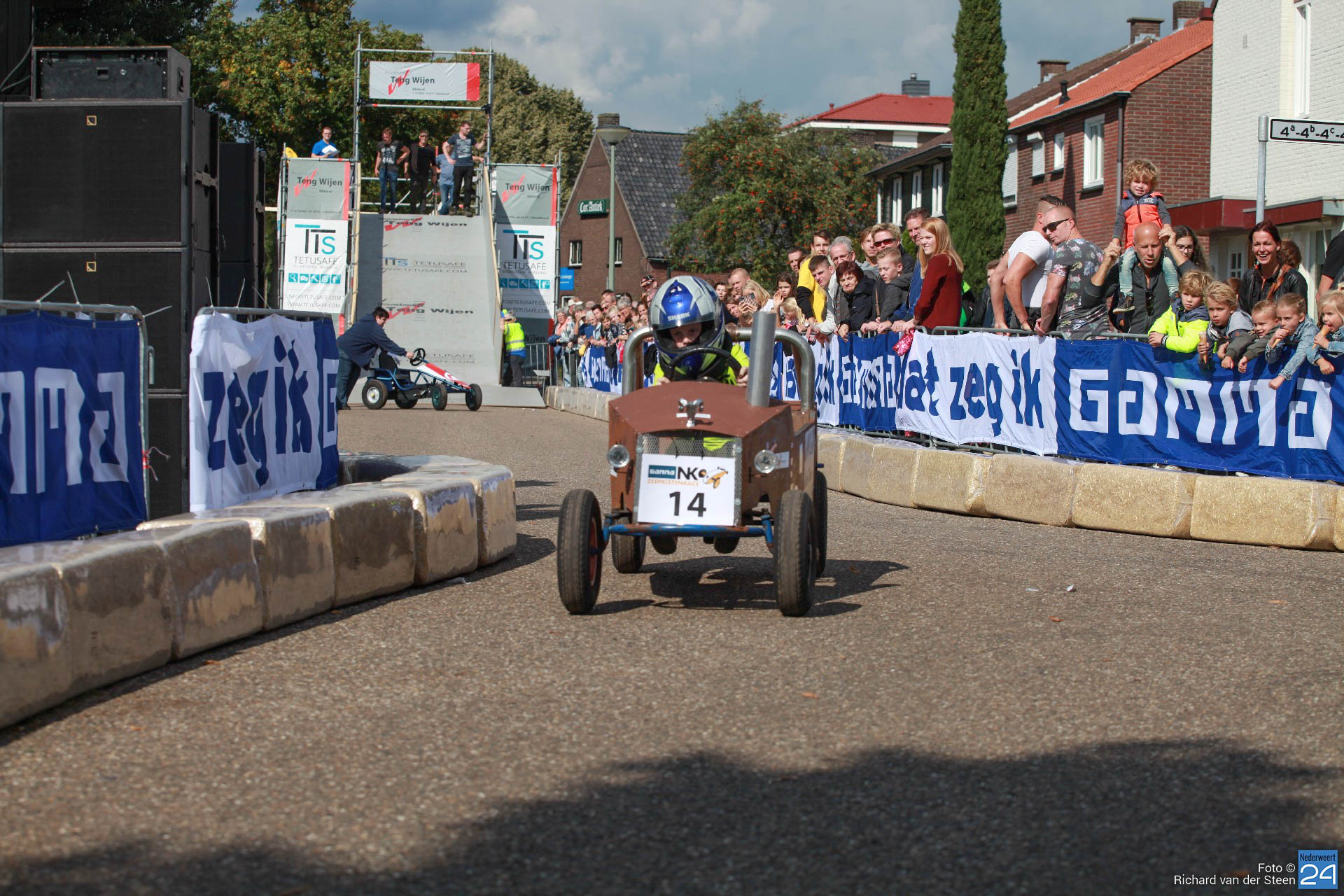Dit jaar lag de baan vlak bij Brug 15 op Steer waar je naar beneden gaat bij de waterscouting. De nieuwe locatie zorgde voor meer G-krachten en de deelnemers gingen net wat sneller over de baan. Het NK junioren was voor jongeren van 6 t/m 15 jaar. Het NK senioren voor deelnemers vanaf 16 jaar. Met een fantastische schans, mogelijk gemaakt door Ron Wijen en zijn team, vlogen de zeepkisten voorbij om vervolgens door de ‘wasstraat‘ en de finishlijn te racen. Een genot om naar te kijken en een fantastisch evenement voor Nederweert.