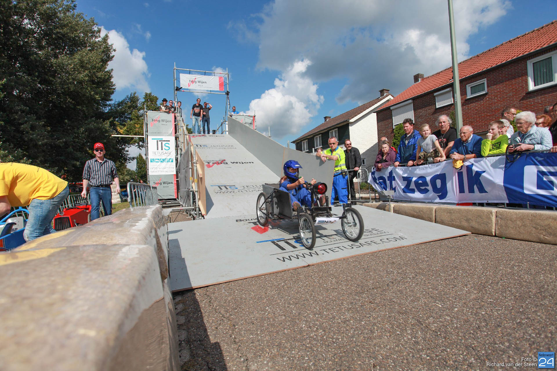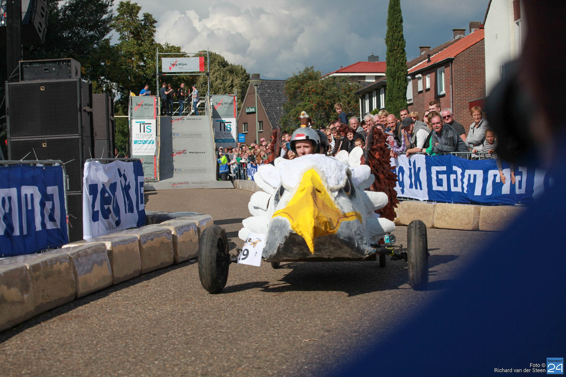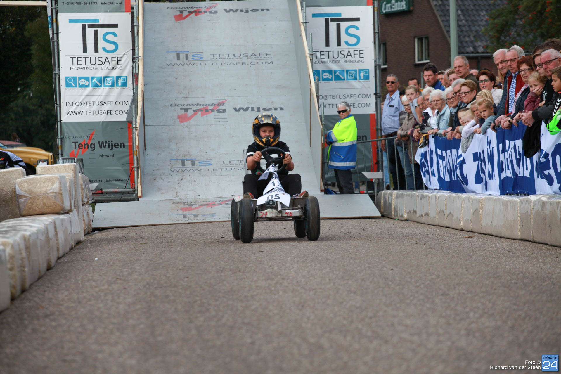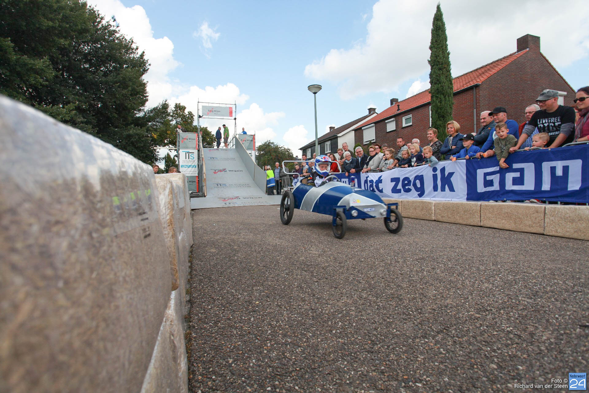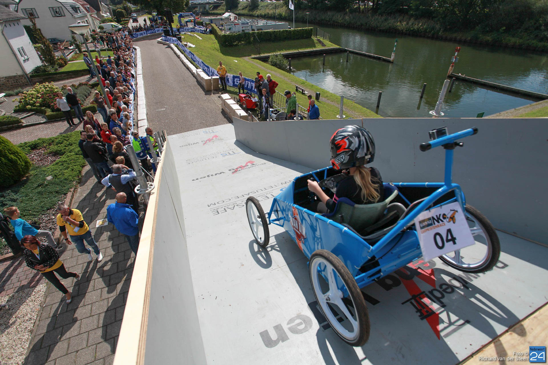 Dit jaar lag de baan vlak bij Brug 15 op Steer waar je naar beneden gaat bij de waterscouting. De nieuwe locatie zorgde voor meer G-krachten en de deelnemers gingen net wat sneller over de baan. Het NK junioren was voor jongeren van 6 t/m 15 jaar. Het NK senioren voor deelnemers vanaf 16 jaar. Met een fantastische schans, mogelijk gemaakt door Ron Wijen en zijn team, vlogen de zeepkisten voorbij om vervolgens door de ‘wasstraat‘ en de finishlijn te racen. Een genot om naar te kijken en een fantastisch evenement voor Nederweert.