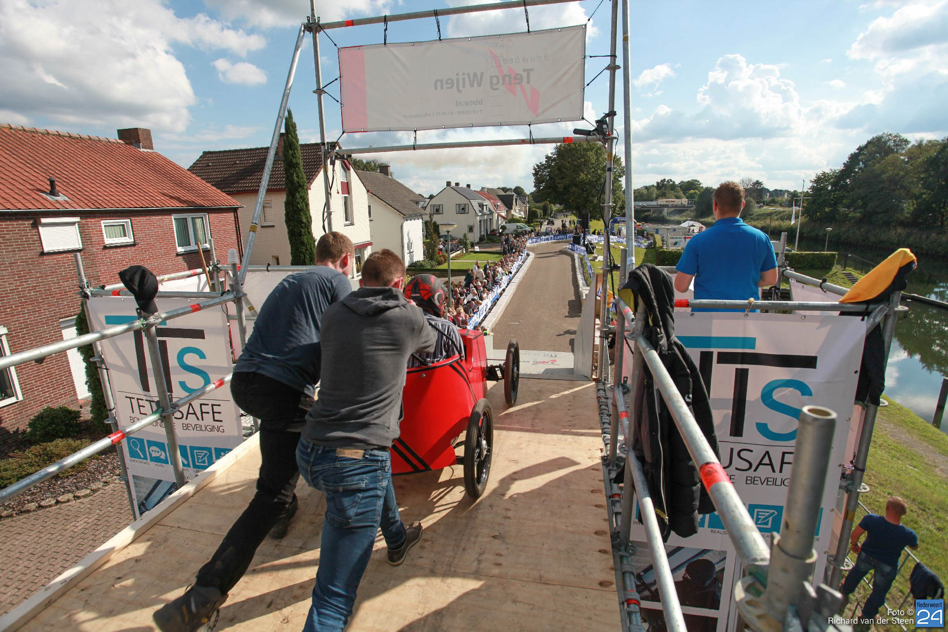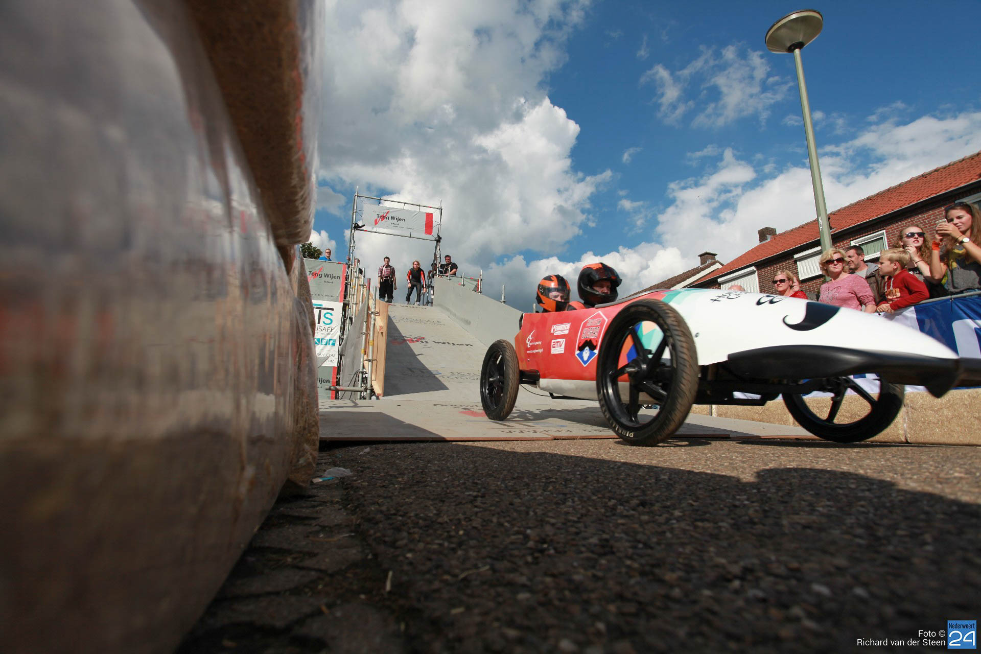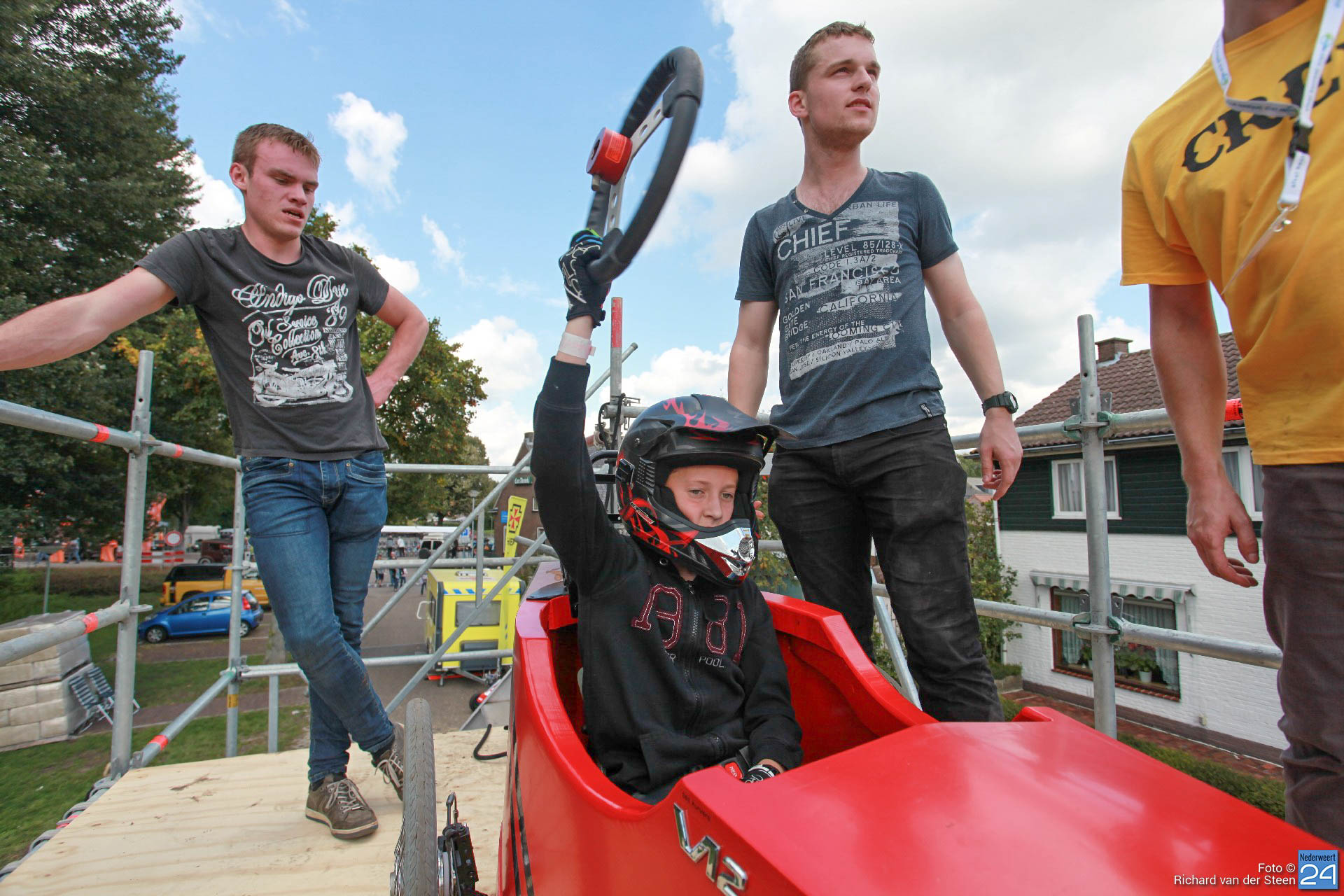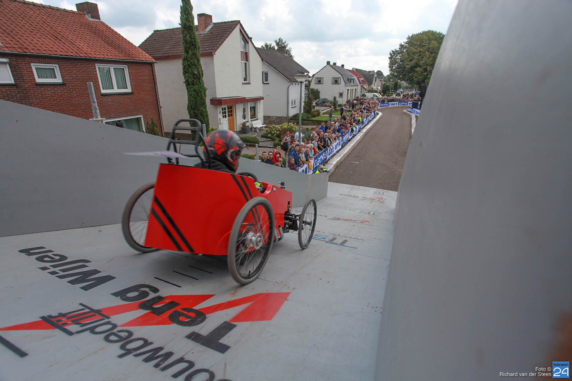Dit jaar lag de baan vlak bij Brug 15 op Steer waar je naar beneden gaat bij de waterscouting. De nieuwe locatie zorgde voor meer G-krachten en de deelnemers gingen net wat sneller over de baan. Het NK junioren was voor jongeren van 6 t/m 15 jaar. Het NK senioren voor deelnemers vanaf 16 jaar. Met een fantastische schans, mogelijk gemaakt door Ron Wijen en zijn team, vlogen de zeepkisten voorbij om vervolgens door de ‘wasstraat‘ en de finishlijn te racen. Een genot om naar te kijken en een fantastisch evenement voor Nederweert.