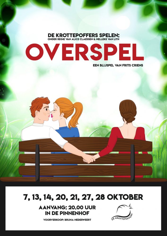 De speeldata van ‘Overspel’ zijn 7, 13, 14, 20, 21, 27 en 28 oktober om 20.00 uur en 15 oktober om 15.00 uur, uiteraard allemaal te zien in de Pinnenhof in Nederweert. Kaarten zijn vanaf 21 september te koop bij Bruna Gommans in Nederweert en kosten €9,- euro per stuk. Deze kunnen alleen contant betaald worden, pinnen is helaas niet mogelijk. Kaarten telefonisch reserveren is niet mogelijk.