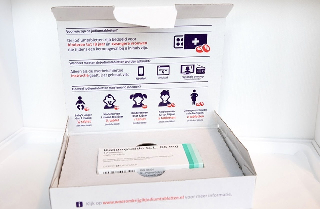 In de zone van 20-100 km rondom een kerncentrale ontvangen huishoudens met kinderen tot 18 jaar per post een doosje jodiumtabletten. Ongeboren baby’s en kinderen tot 18 jaar lopen het meeste risico om later schildklierkanker te krijgen door opname van radioactief jodium. De kans op schildklierkanker door radioactief jodium neemt af naarmate mensen ouder zijn.