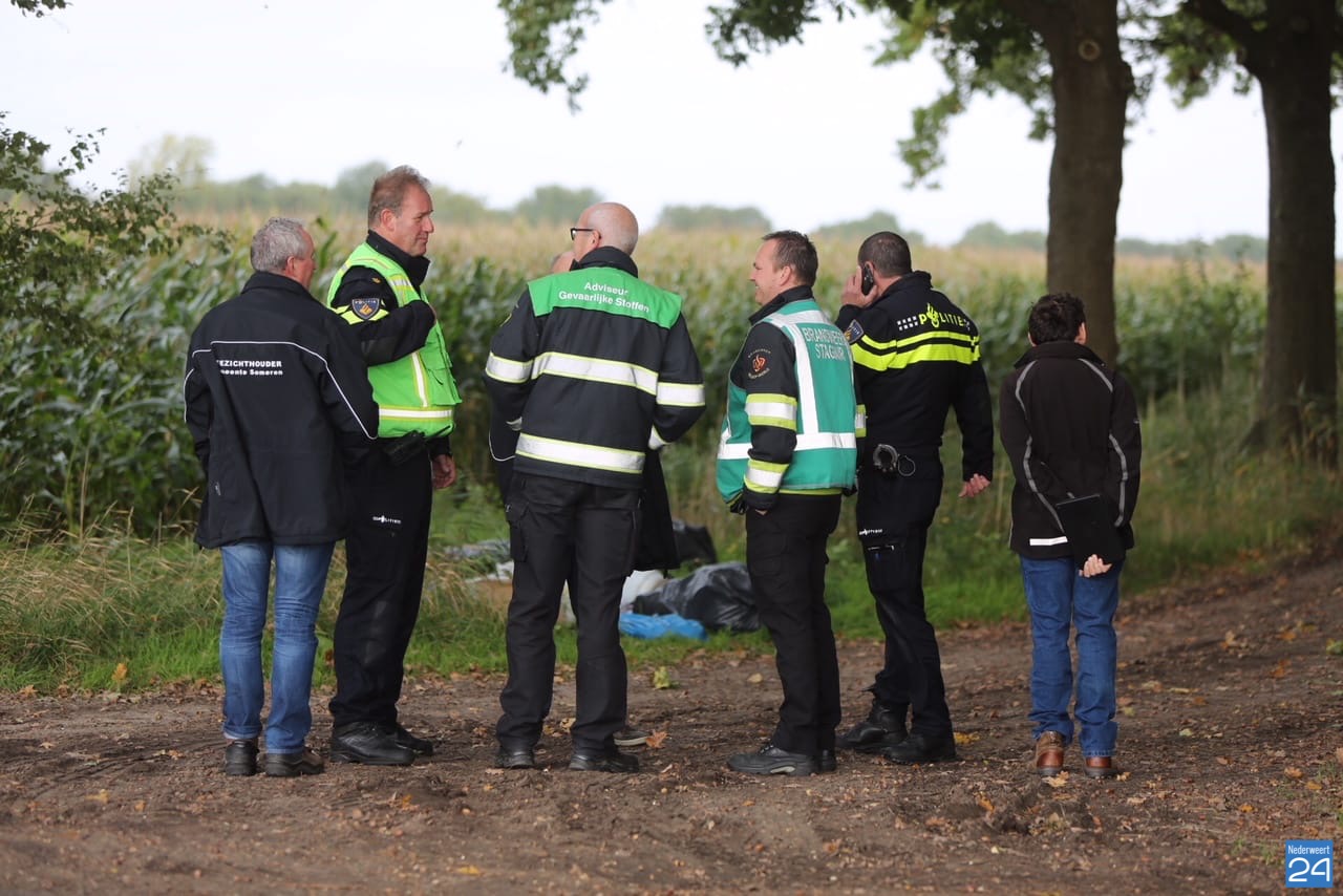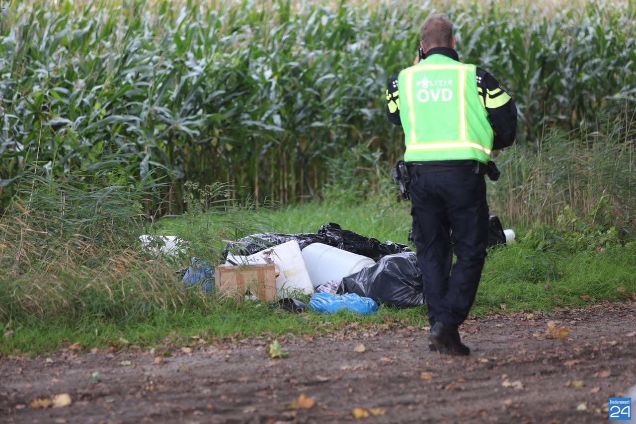 Een voorbijganger ontdekte het chemisch afval en heeft dit bij de politie gemeld. Het afval is vermoedelijk afkomstig van een drugslab uit de omgeving en is gedumpt langs een zandpad.