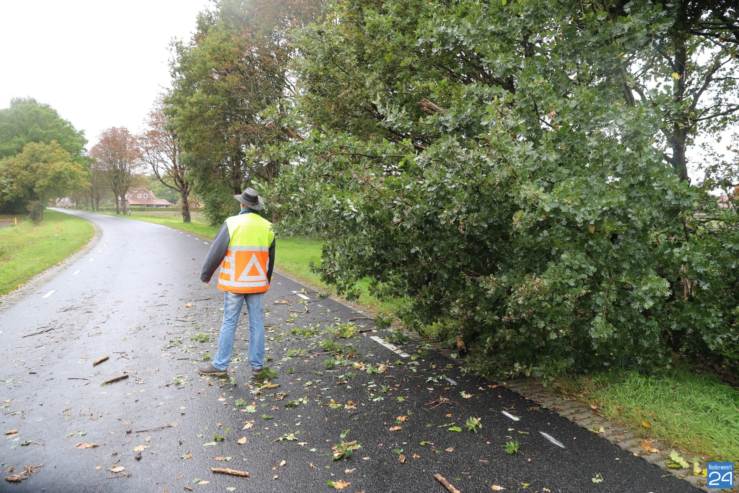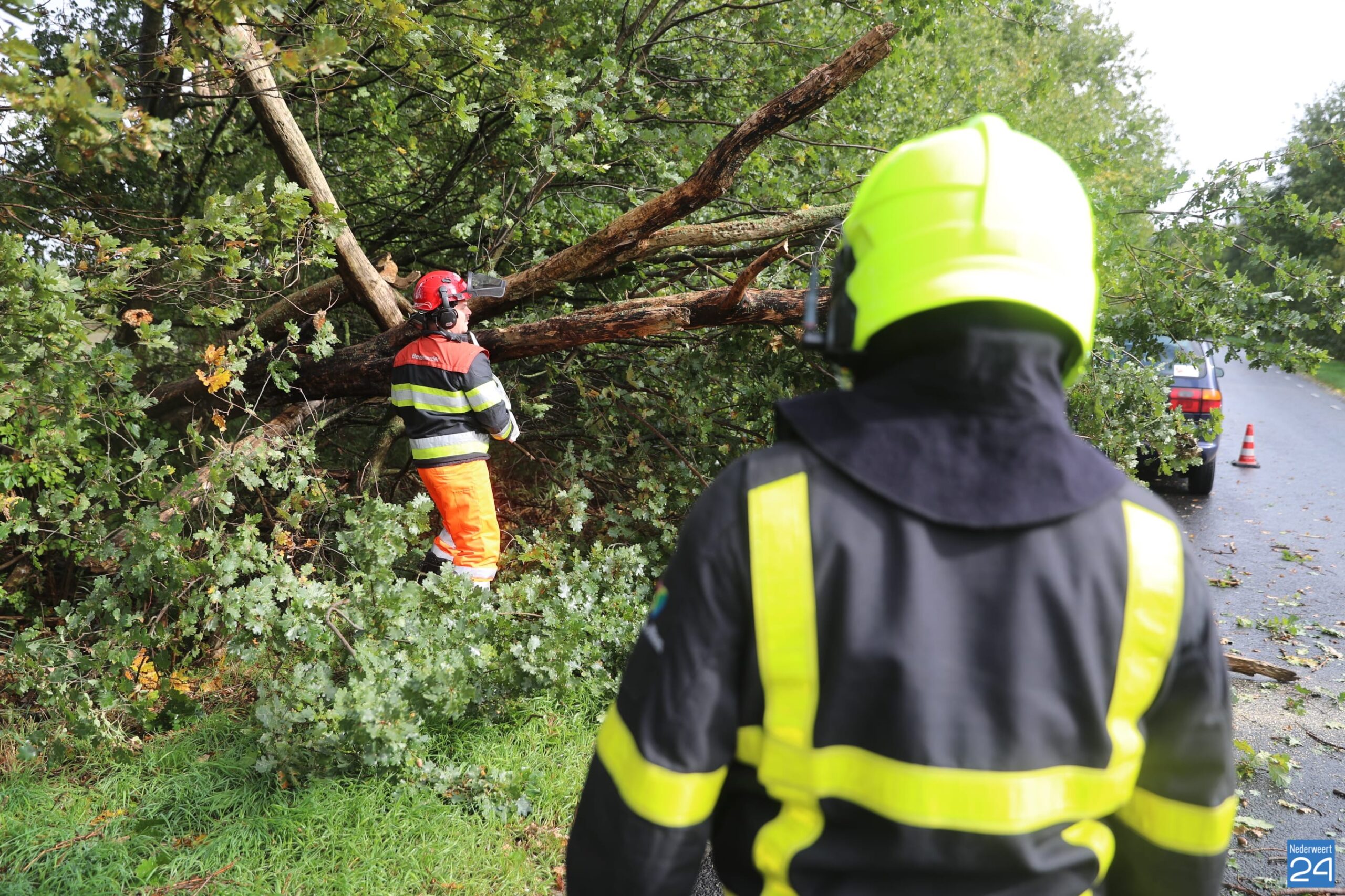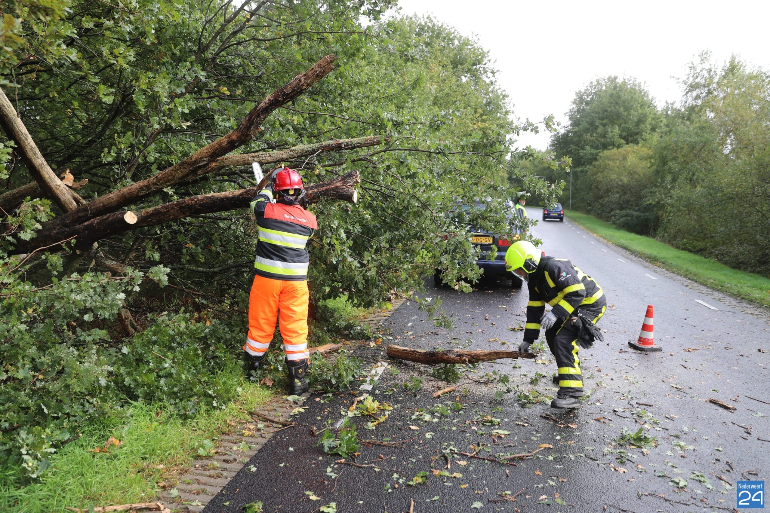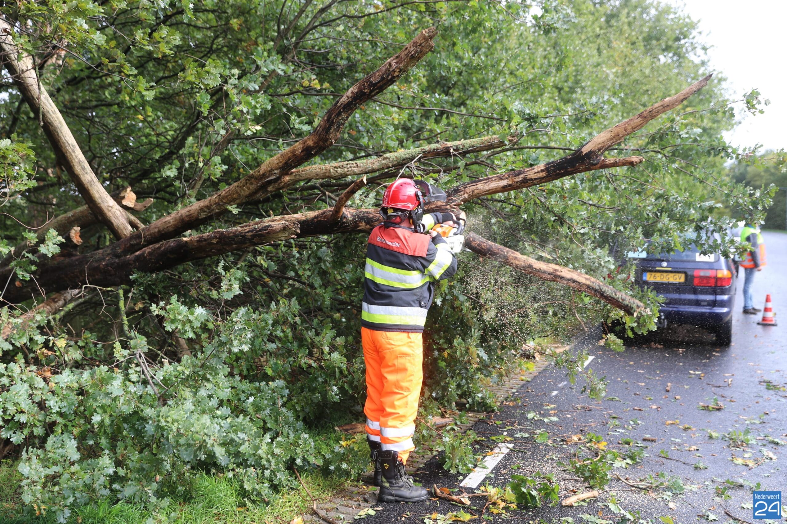 Brandweermensen hebben de boom in stukken gezaagd en aan de kant gelegd. De gemeente zal het hout verder opruimen.