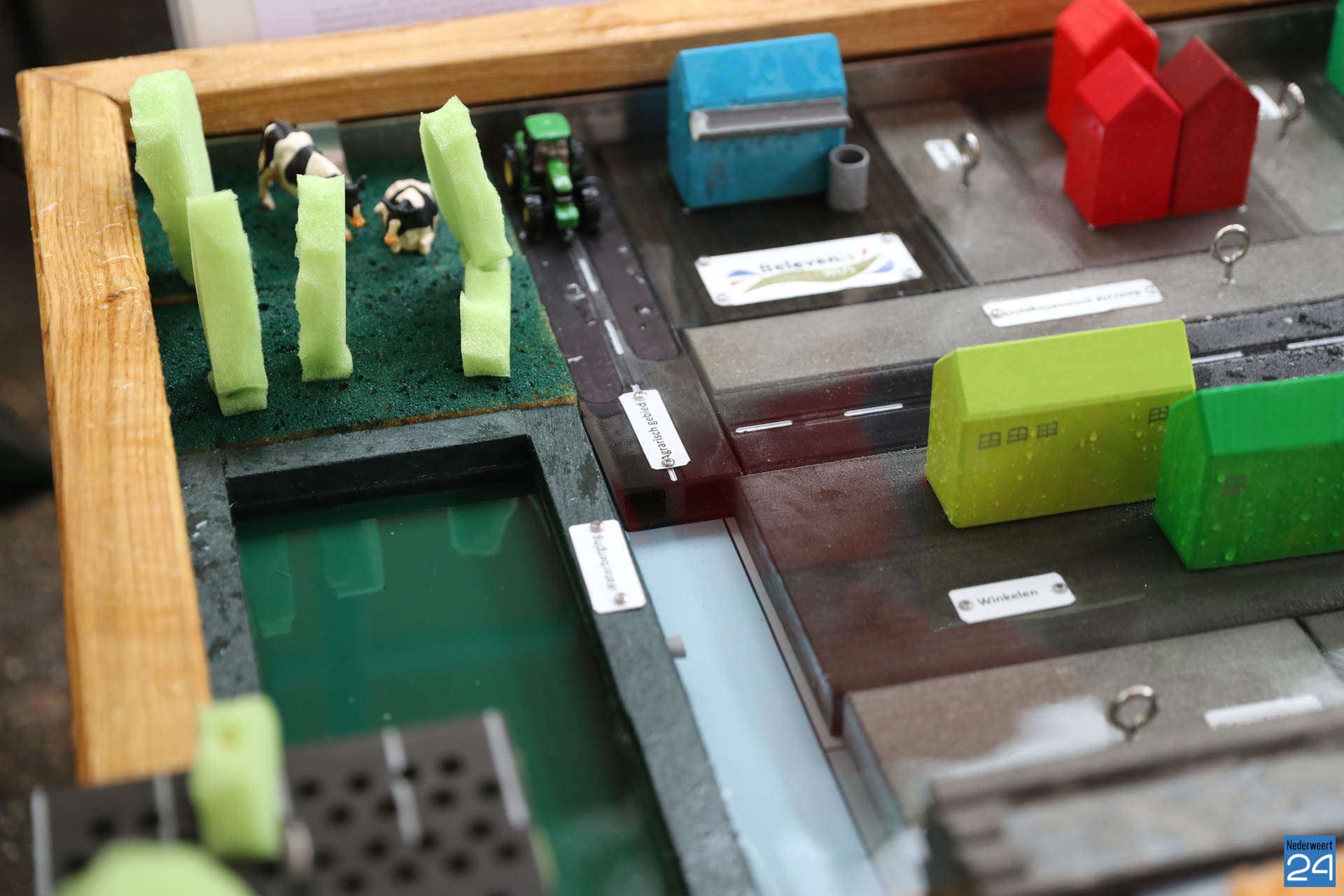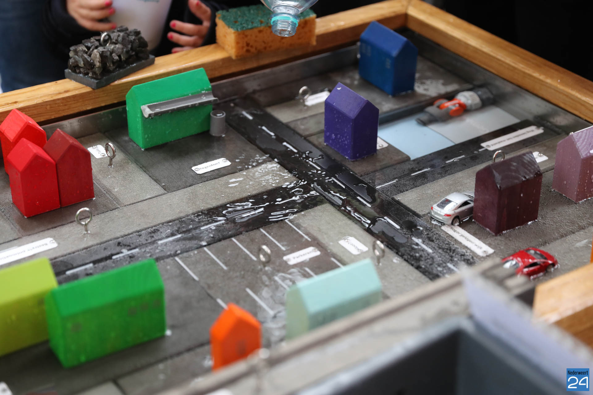Dat kan onder meer met het educatiemodel wateroverlast in de stad. De tafel bestaat uit bebouwing, weilanden en verharde oppervlaktes en laat het effect zien van het veranderende klimaat. Bijvoorbeeld wat er gebeurt bij extreme regenbuien. Buien worden met een gieter over de stad uitgestort tot er sprake is van wateroverlast. Waar wateroverlast ontstaat, kunnen vervolgens weer ‘droge voeten’ worden gecreëerd.