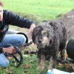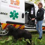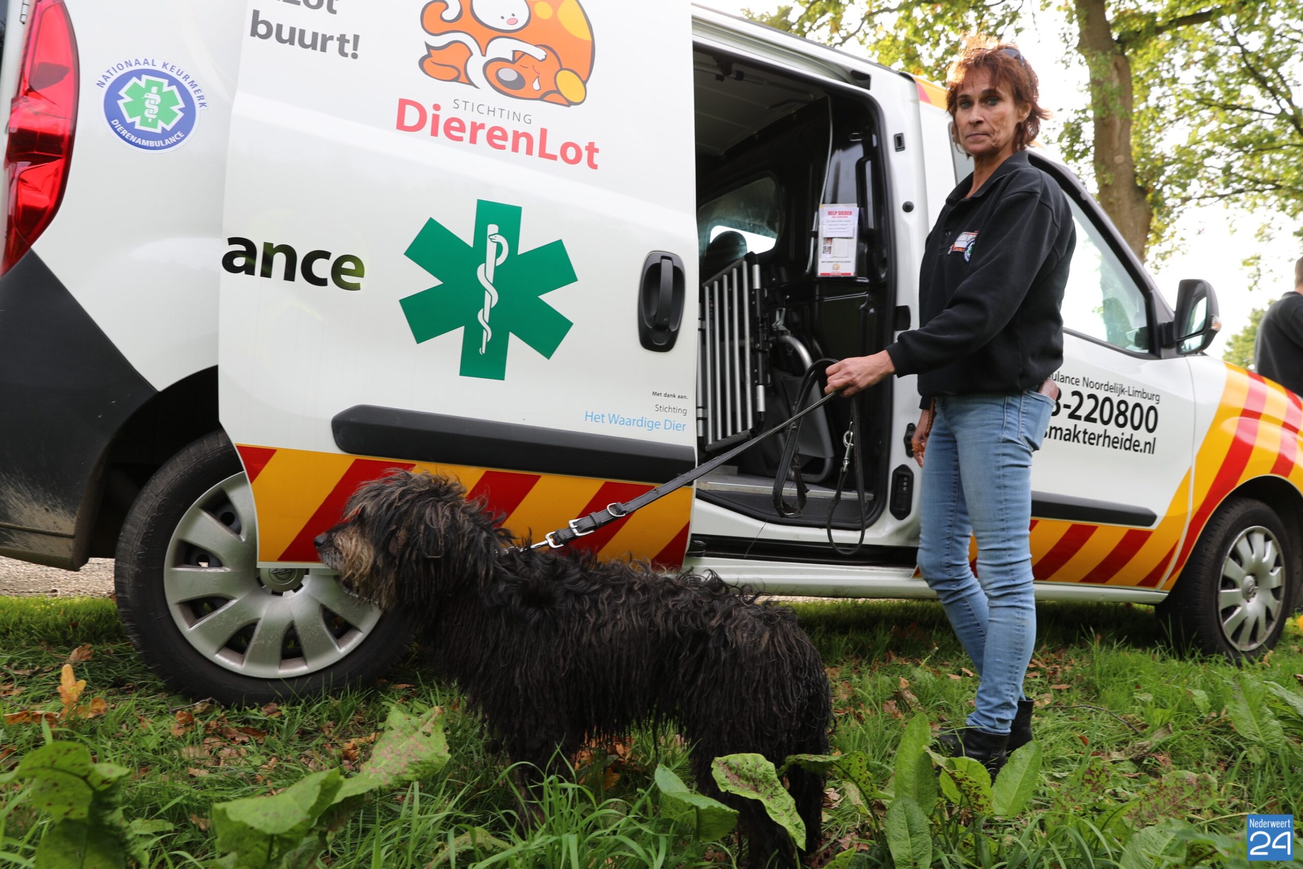 De hond was al 6 dagen vermist. Een medewerkster van de dierenambulance neemt het beestje mee voor onderzoek en om extra vocht toe te dienen. Daarna kan het beestje terug naar zijn baasje.