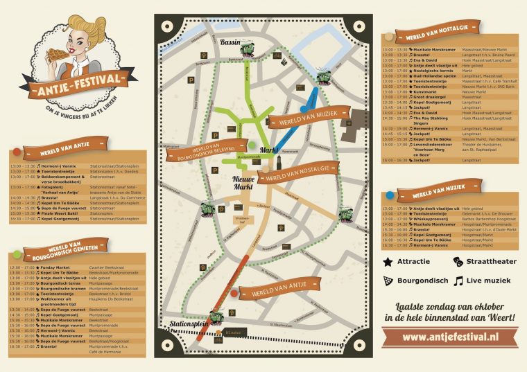 Zondag 29 oktober organiseert Centrummanagement Weert voor de eerste keer het feestelijke Antje Festival. Bezoek en ontdek de karakteristiek van Weert tijdens het gloednieuwe Antje Festival. Beleef een nostalgische en Bourgondische binnenstad aan de hand van vier feestelijk ingerichte themawerelden. Tijdens Antje Festival vind je in de Weerter binnenstad de Wereld van Antje, Wereld van Nostalgie, Wereld van Bourgondisch genieten en de Wereld van Muziek. Verspreid over het centrum worden bezoekers verrast met veel ondernemersacties, bijzonder entertainment en diverse attracties en activiteiten.