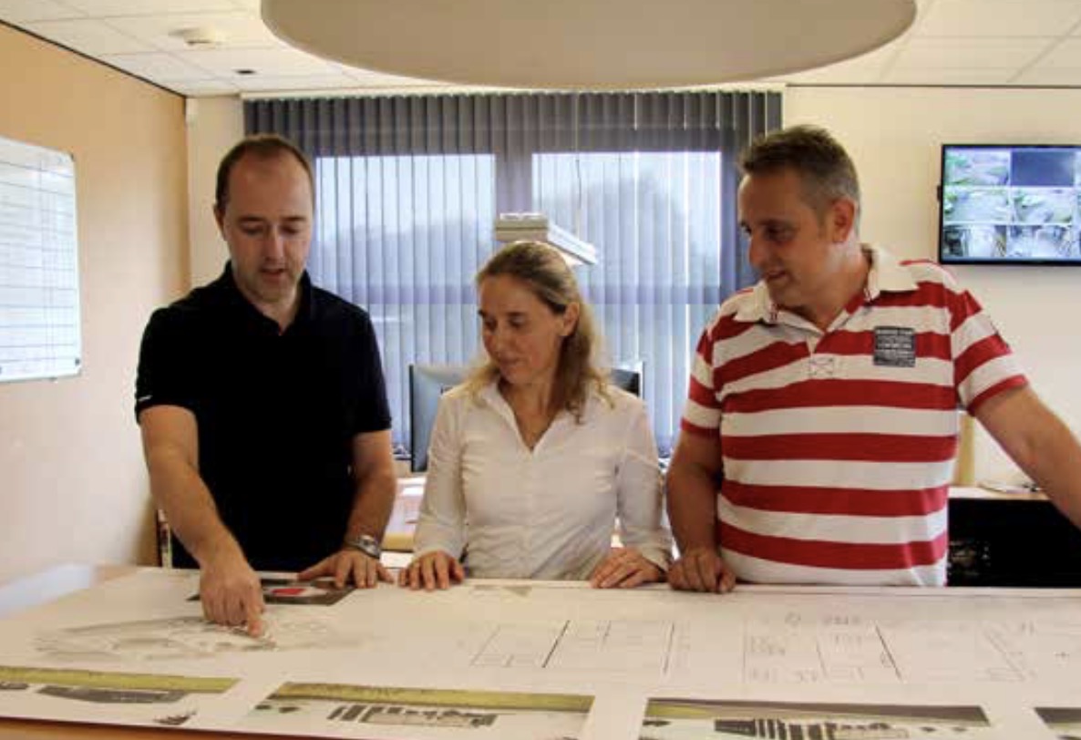 Voor die realisatie is een projectteam samengesteld onder regie van OML. De gemeente Roermond, ambtenaren van diverse afdelingen en – in dit geval – aannemer Derckx namen er zitting in. “De communicatie met OML is snel en doeltreffend verlopen”, licht Rob Peeters toe. “Alles is telkens tot in detail voorbereid en je krijgt direct ant- woord op al je vragen, vaak zelfs al binnen een uur.” Jeroen Bertjens (l) en Sandra en Rob Peeters buigen zich over de tekeningen van de nieuwbouw.