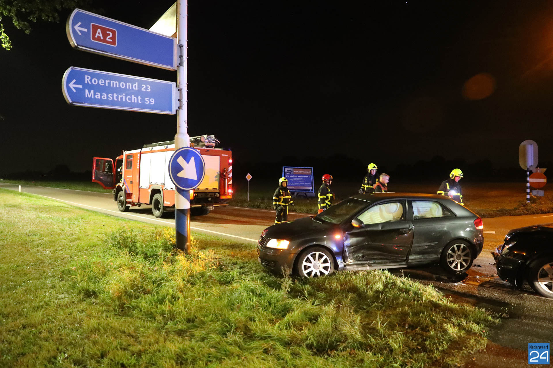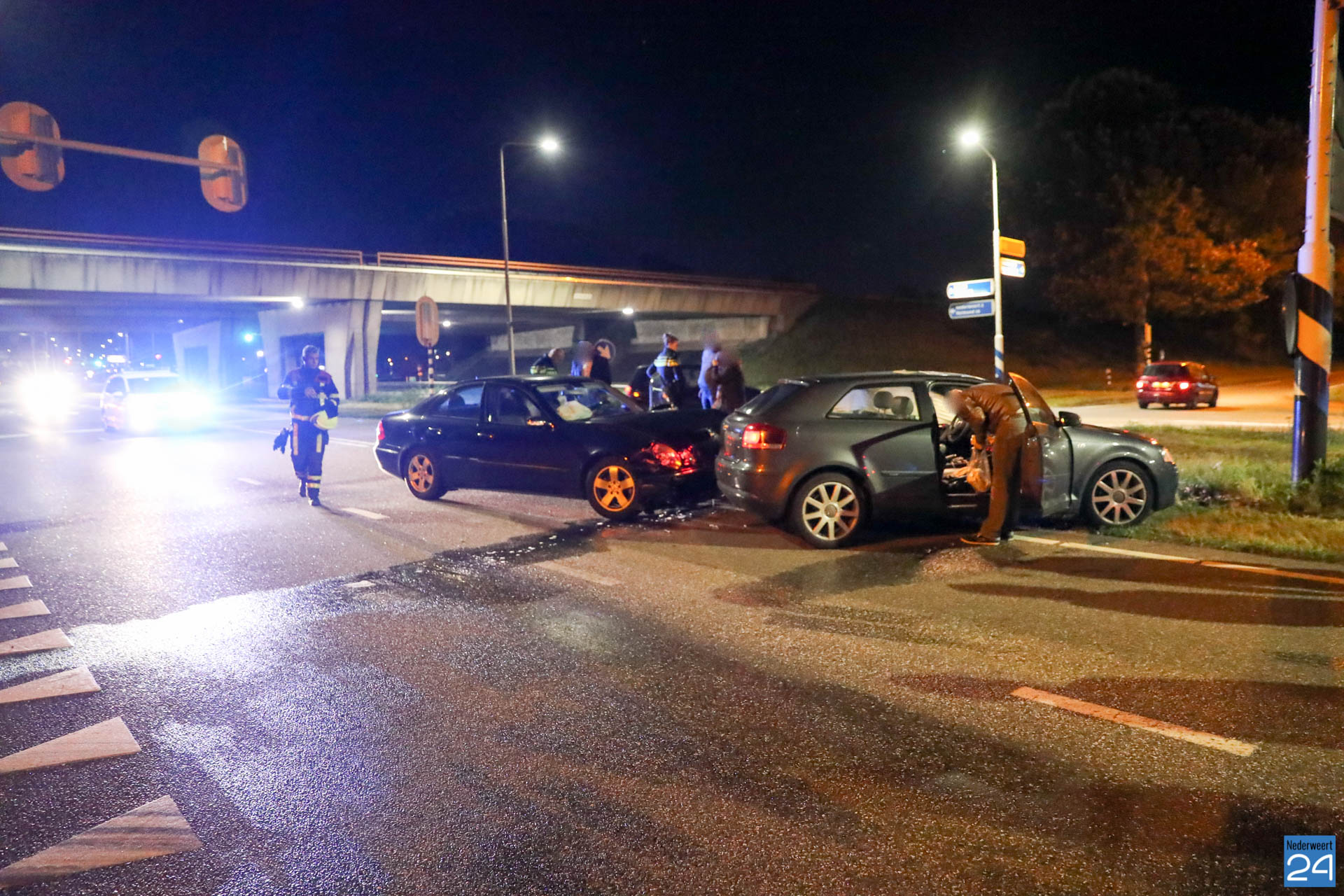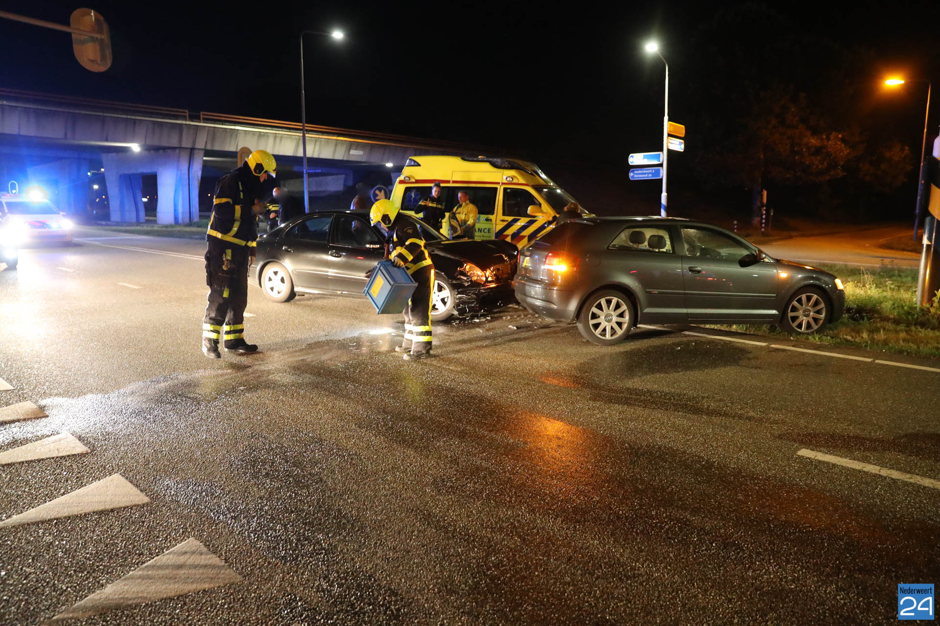Eén personenauto reed vanaf de snelweg A2 de kruising op terwijl de andere auto vanuit Nederweert, onder het viaduct door, de kruising op reed. Het kruispunt is door verkeerslichten geregeld maar door nog onbekende oorzaak zijn ze met elkaar in botsing gekomen. De auto die vanaf de snelweg kwam werd vol in de zijkant geraakt. De inzittende is nagekeken door het ambulancepersoneel maar kwam met de schrik vrij. De twee inzittenden van de auto die vanuit Nederweert kwamen waren flink geschrokken. Ze werden ook nagekeken door het ambulancepersoneel maar hoefden niet mee naar het ziekenhuis. Ze werden allemaal door familie opgehaald.