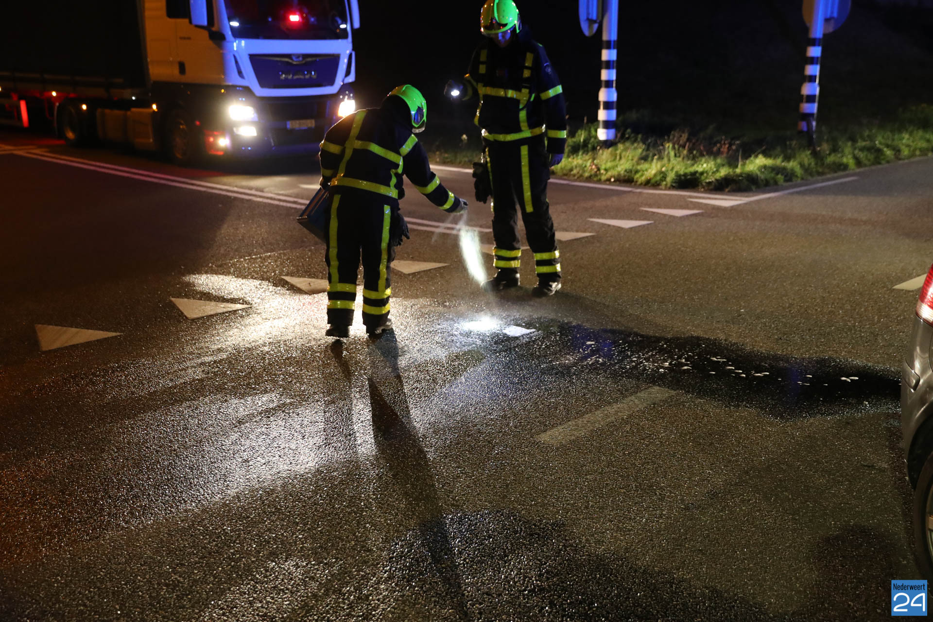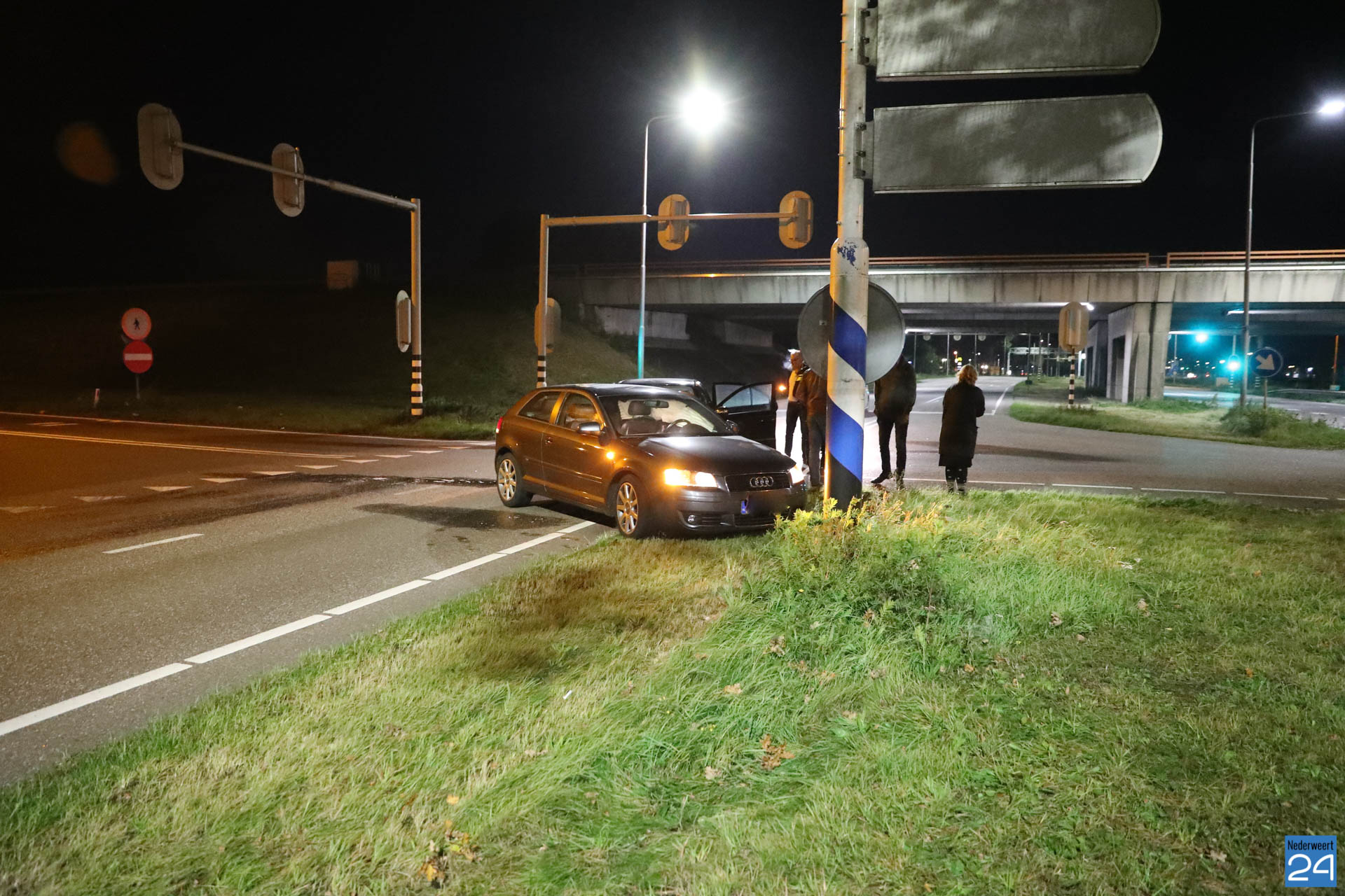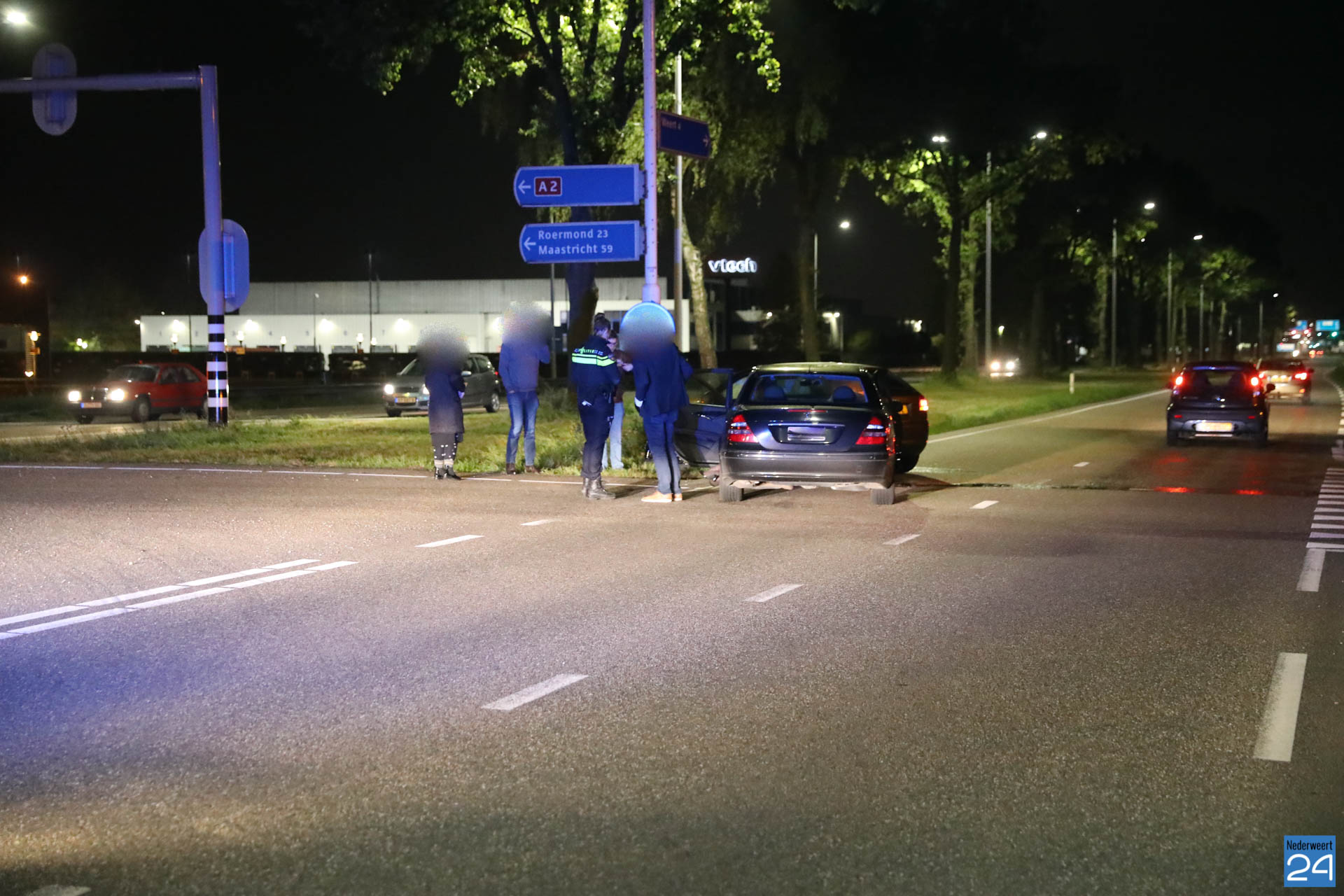 Eén personenauto reed vanaf de snelweg A2 de kruising op terwijl de andere auto vanuit Nederweert, onder het viaduct door, de kruising op reed. Het kruispunt is door verkeerslichten geregeld maar door nog onbekende oorzaak zijn ze met elkaar in botsing gekomen. De auto die vanaf de snelweg kwam werd vol in de zijkant geraakt. De inzittende is nagekeken door het ambulancepersoneel maar kwam met de schrik vrij. De twee inzittenden van de auto die vanuit Nederweert kwamen waren flink geschrokken. Ze werden ook nagekeken door het ambulancepersoneel maar hoefden niet mee naar het ziekenhuis. Ze werden allemaal door familie opgehaald.
