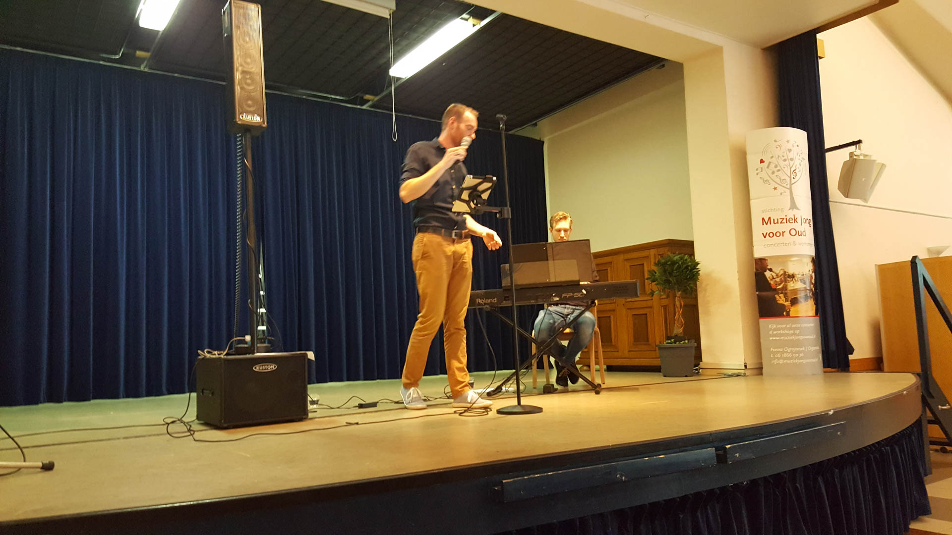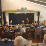 Na de pauze met koffie/thee en vlaai was het de beurt aan Rob Reynders en Ben van Daal. Rob uit Roermond studeert Jazz Zang aan het conservatorium te Maastricht. Hij is een duizendpoot: Hij zingt, dirigeert, speelt bugel/trompet en piano. Hij componeert en arrangeert, maakt theater en schrijft sketches en gedichten. Zijn partner Ben van Daal, afkomstig uit Linne speelt al ruim 12 jaar piano en heeft een grote interesse voor de Russische klassieke muziek ontwikkeld. Hiermee heeft hij al vele internationale prijzen gewonnen zoals de hoofdprijs van het concours Prix Dominique in Venlo en de 2e prijs van de Piano3Daagse Rotterdam. De heren brachten voortreffelijk muziek ten gehore die bij de aanwezigen gasten goed in het gehoor lagen. Er werd volop meegezongen, met handen gezwaaid en iedereen deed op zijn of haar manier mee.