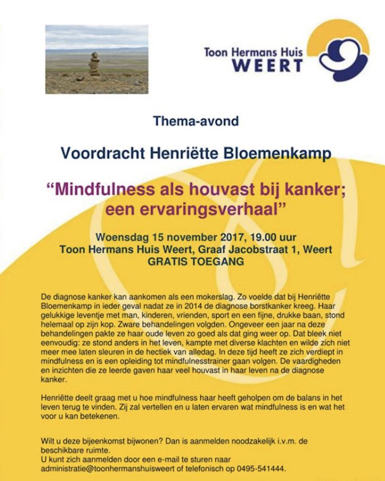 Op woensdagavond 15 november wordt in het Toon Hermans Huis in Weert een lezing verzorgd over mindfulness na kanker.