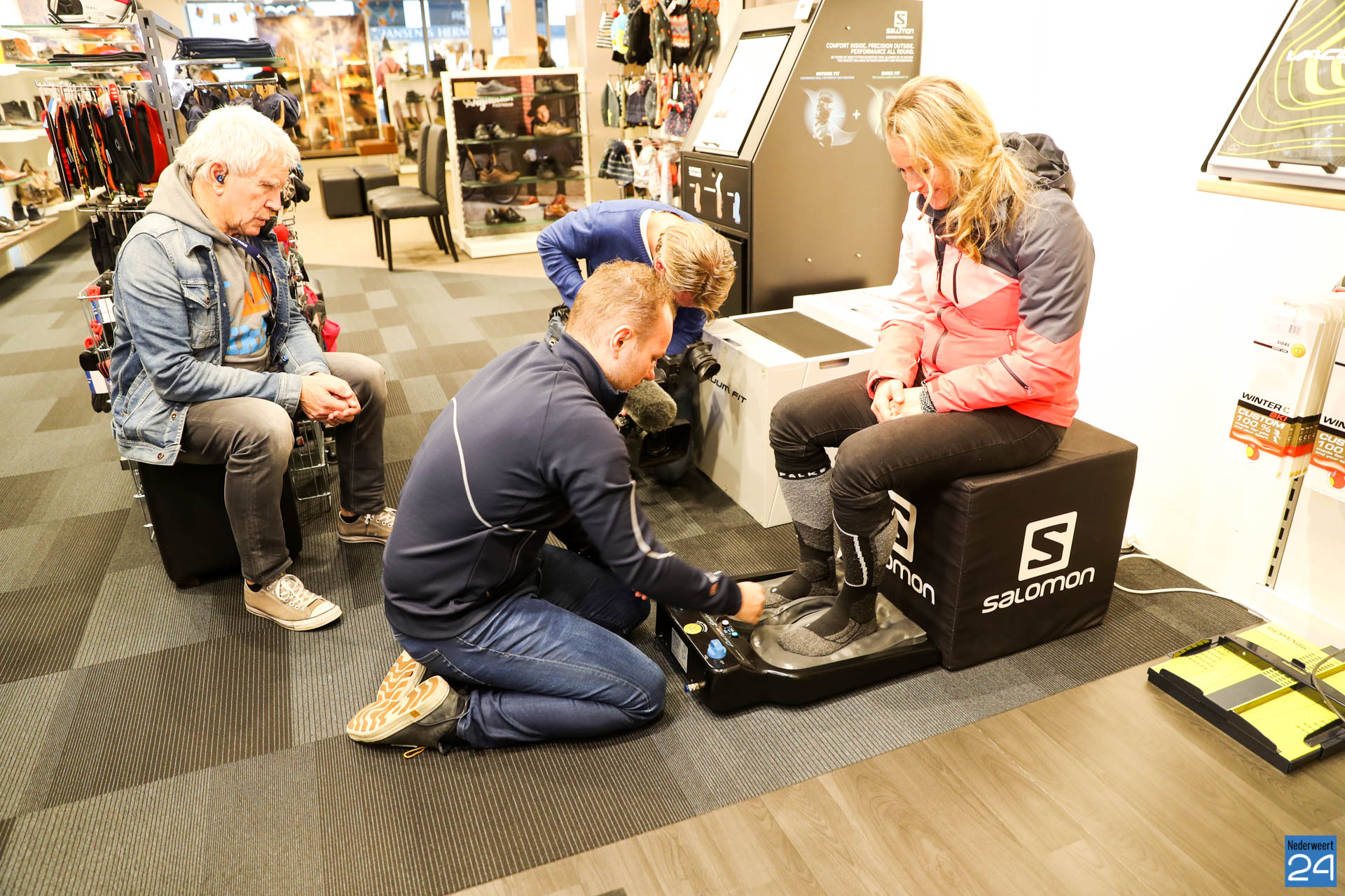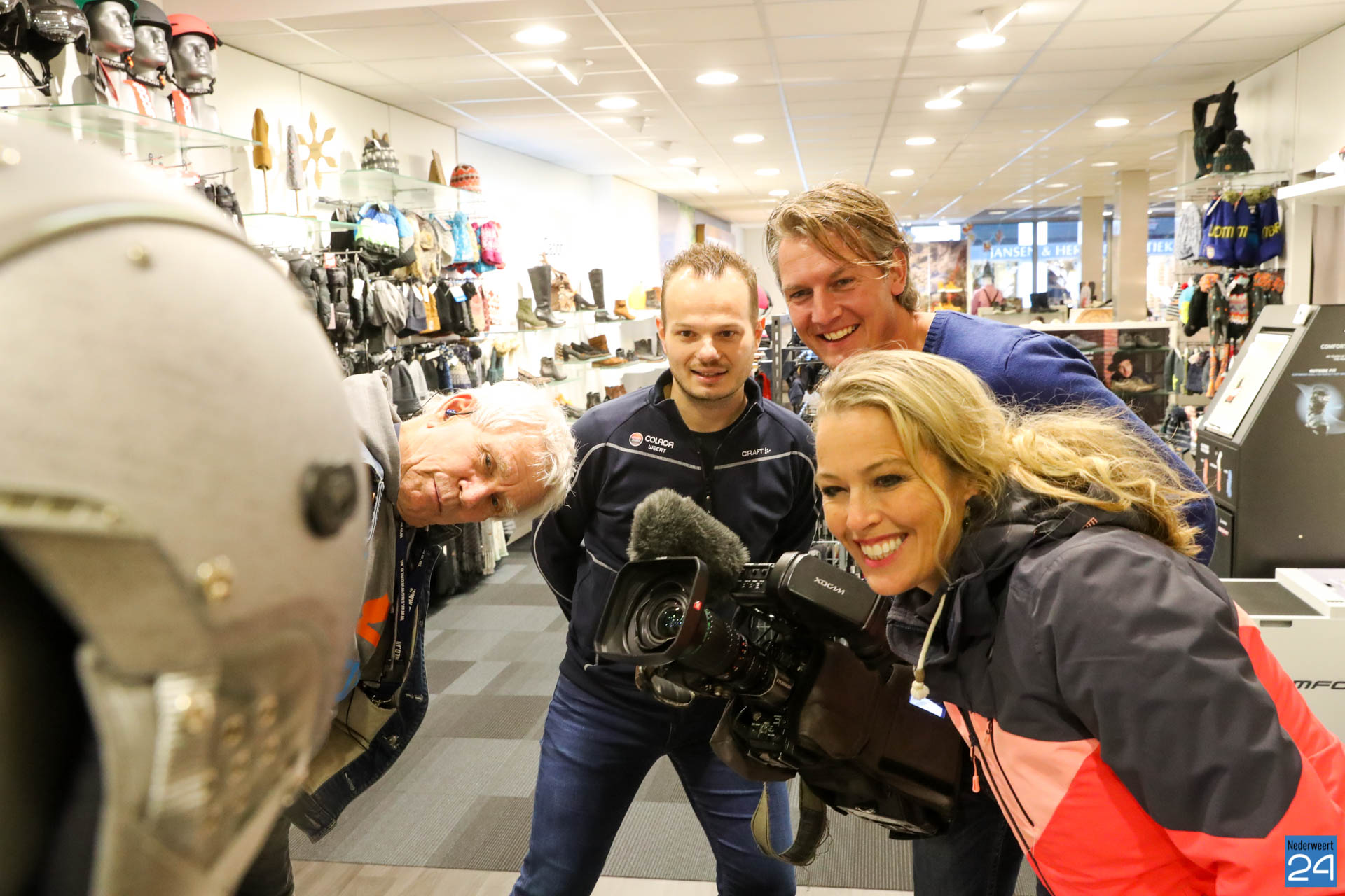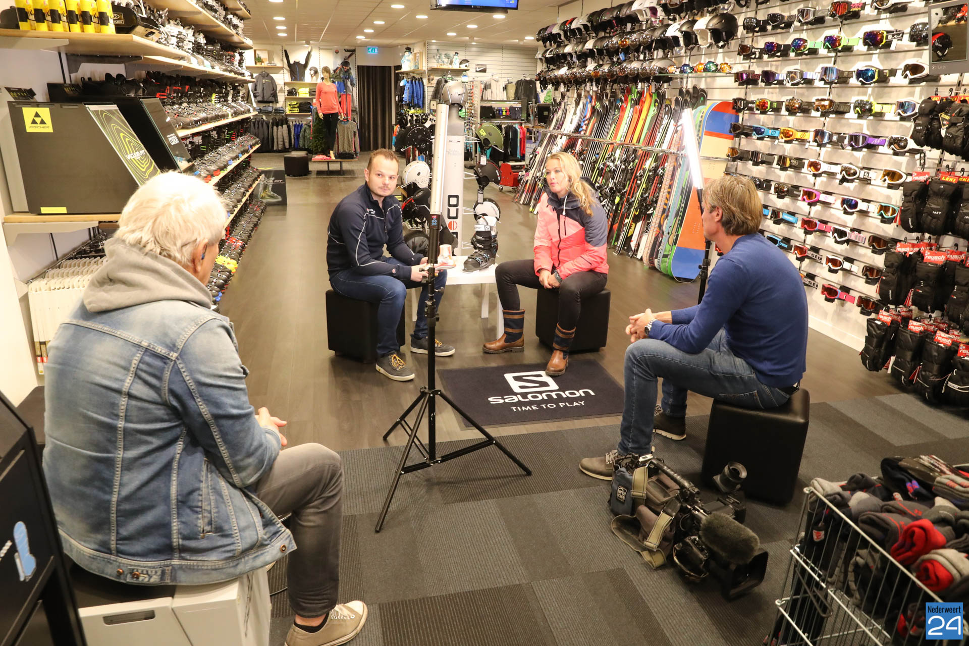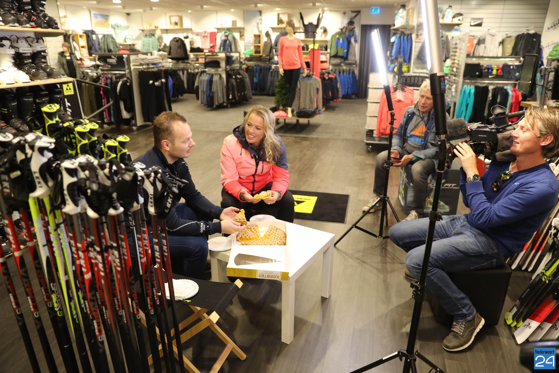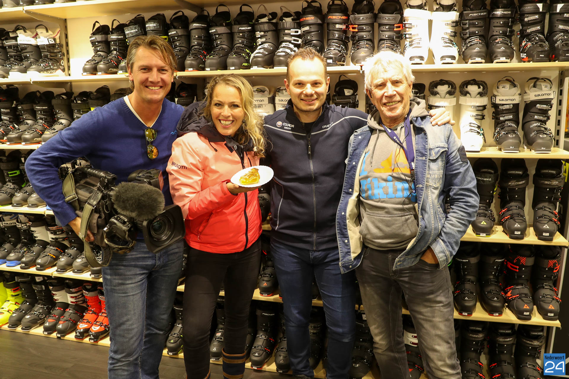 Sophie van Hoytema met het team van RTL SnowMagazine bezocht wintersportspecialist Colada in Weert voor de opname van een item over de laatste ontwikkelingen op het gebied van wintersport.