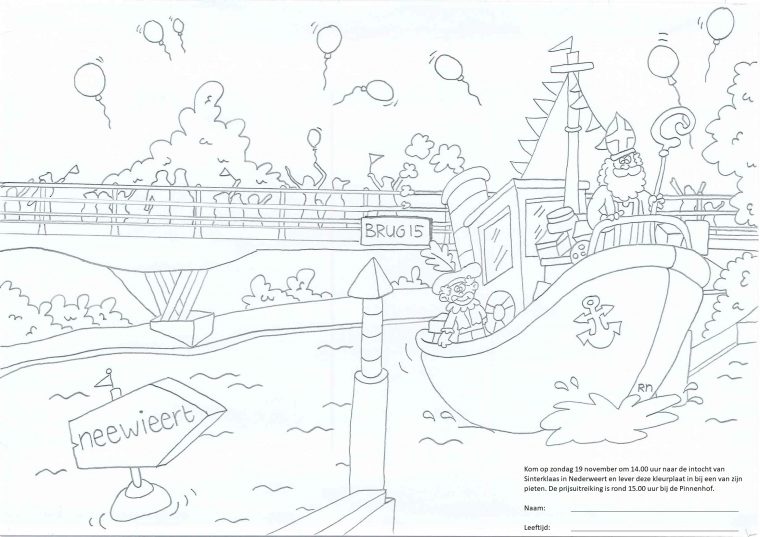 Aanstaande zondag 19 november komen Sinterklaas en zijn zwarte Pieten aan in Nederweert, om 14.00 uur bij Brug 15. Dit jaar organiseert het Sint Nicolaas Comité een kleurwedstrijd voor alle kinderen. Print de kleurplaat uit, kleur hem zo mooi mogelijk in en lever hem in bij een van de Pieten. Rond 15.00 uur is de prijsuitreiking in de Pinnenhof. Er zijn leuke prijzen te winnen. Je kunt de kleurplaat hieronder downloaden.