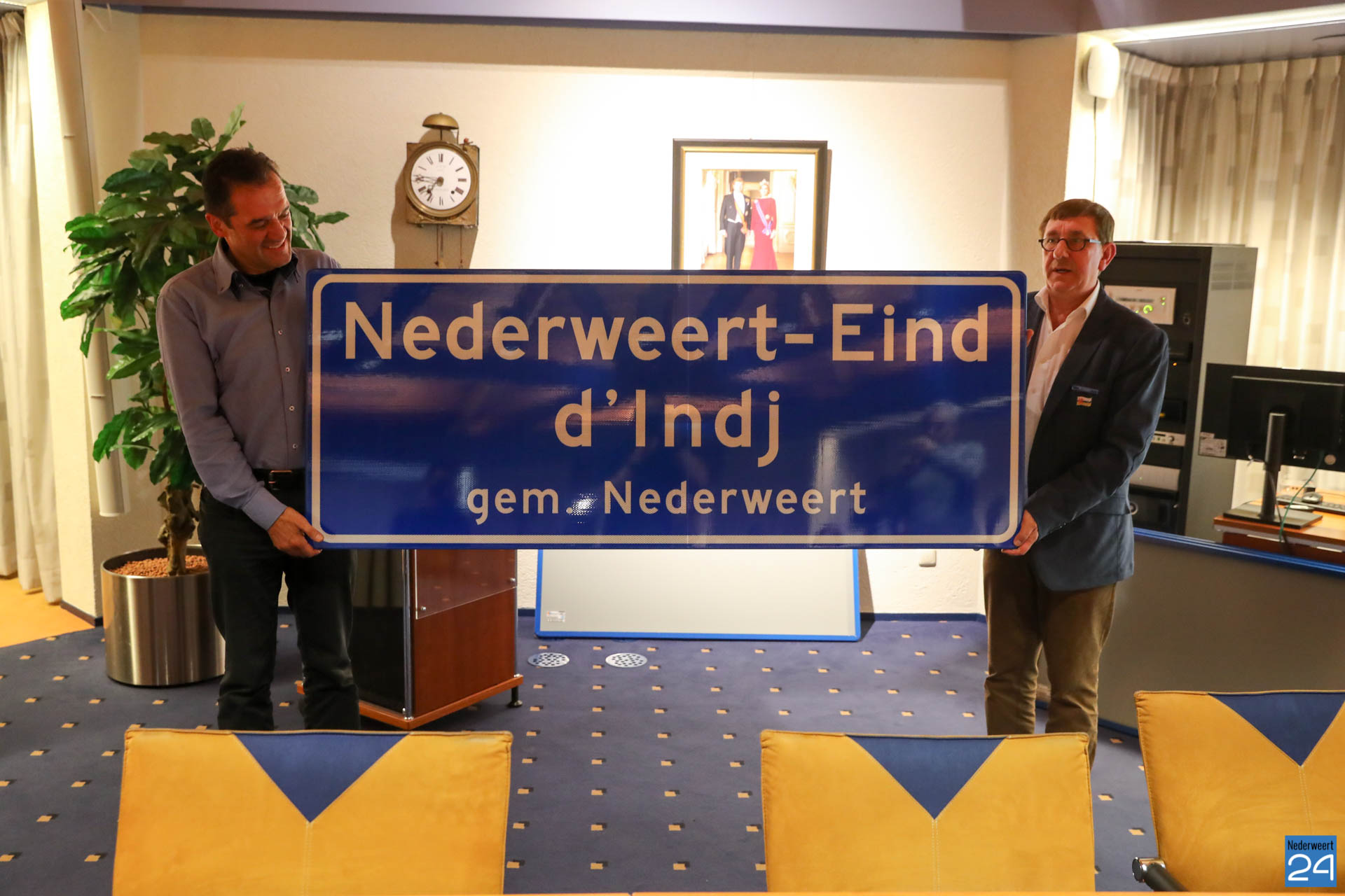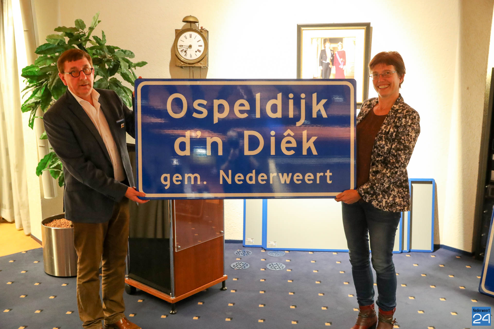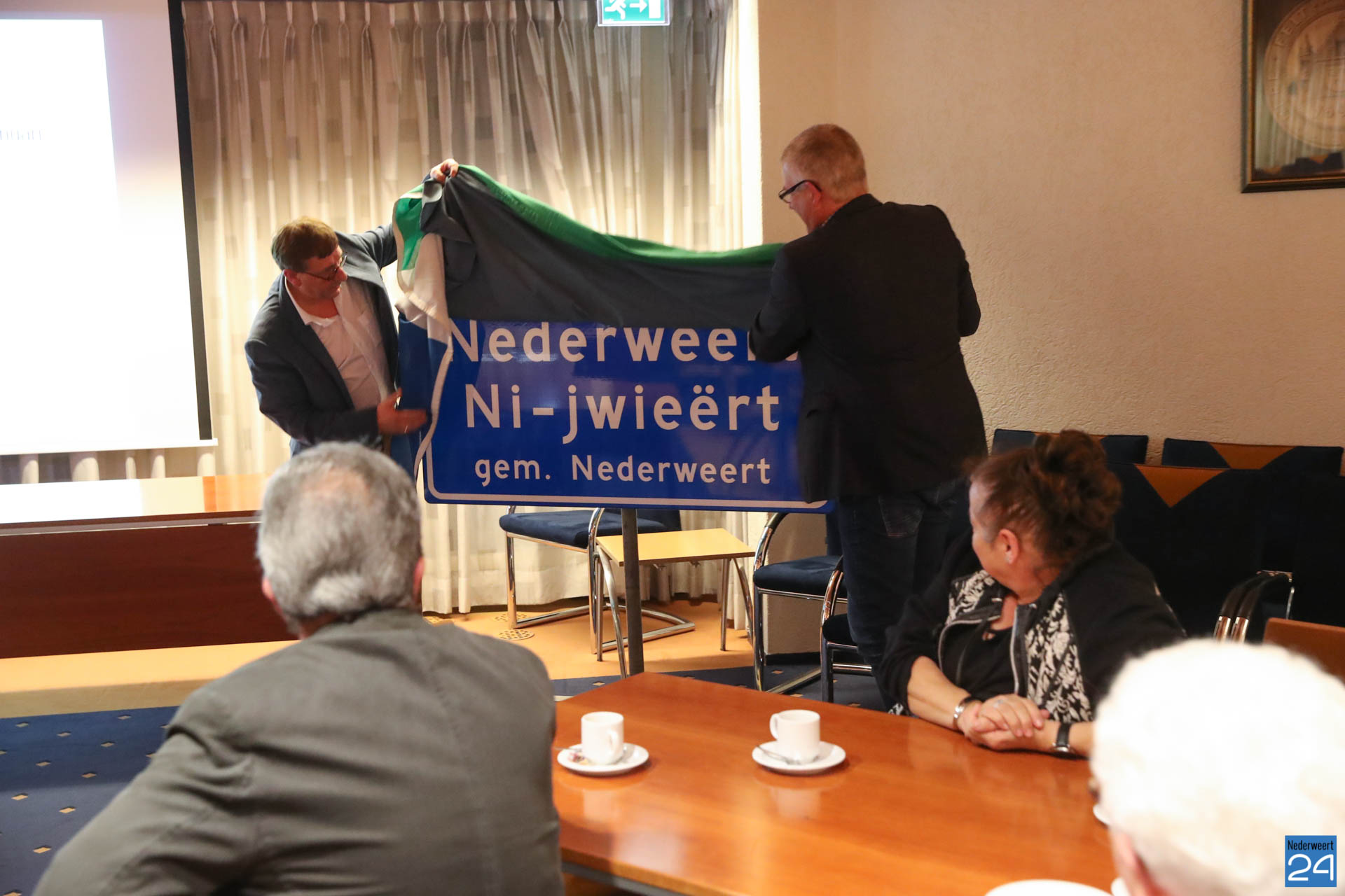 Donderdagavond zijn onder het toeziend oog van dorpsraden, sponsoren, bestuursleden van Heemkundevereniging en het Veldeke de nieuwe ‘komborden‘ van Nederweert onthuld met daarop de kerkdorpen Ni-jwieërt, Doospel, Leivere, d’n Diêk en d’Indj in het dialect.