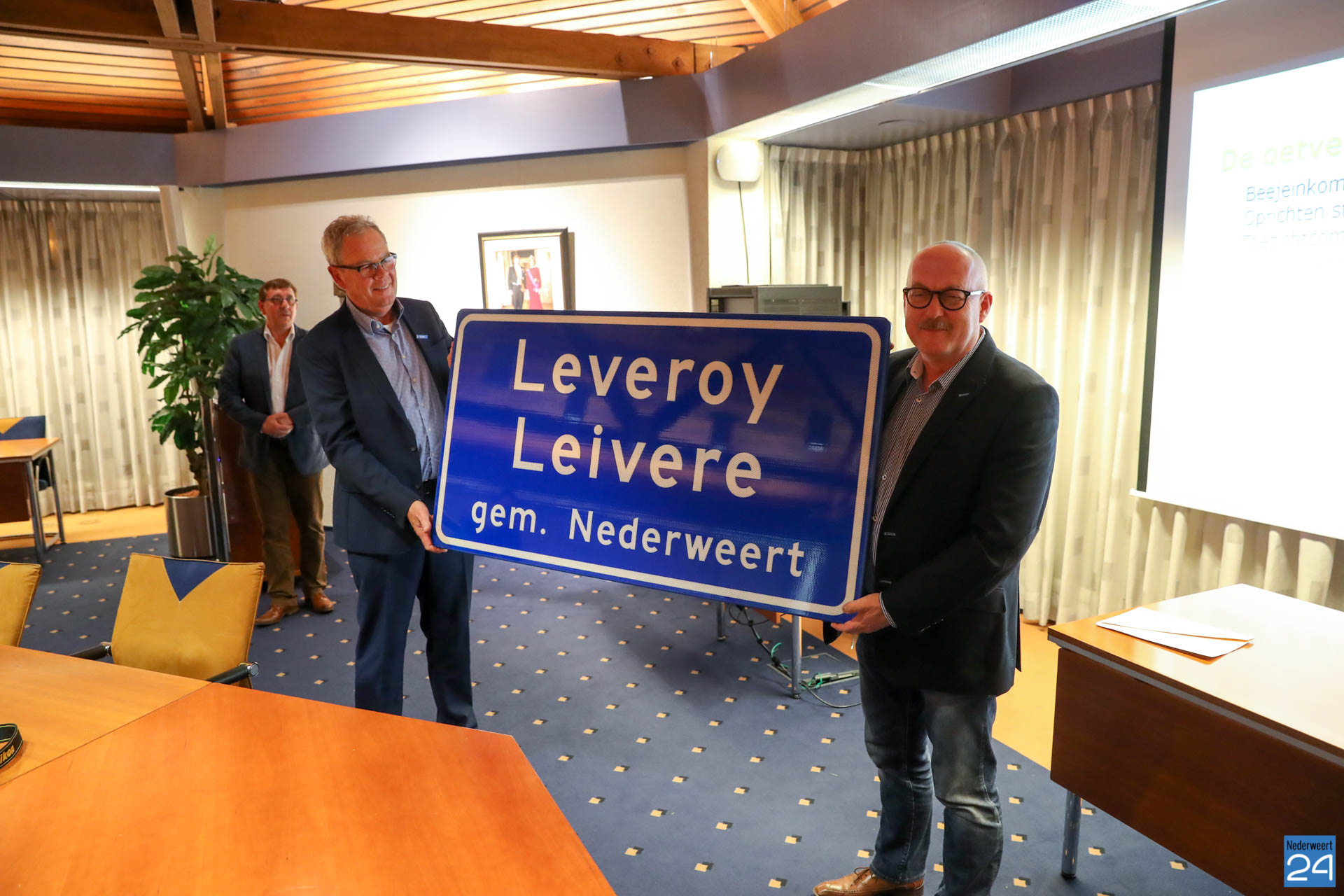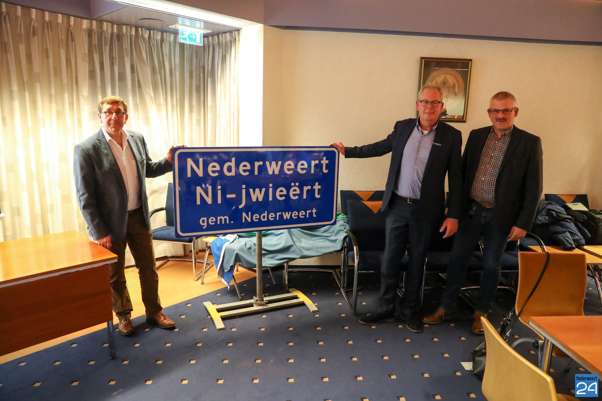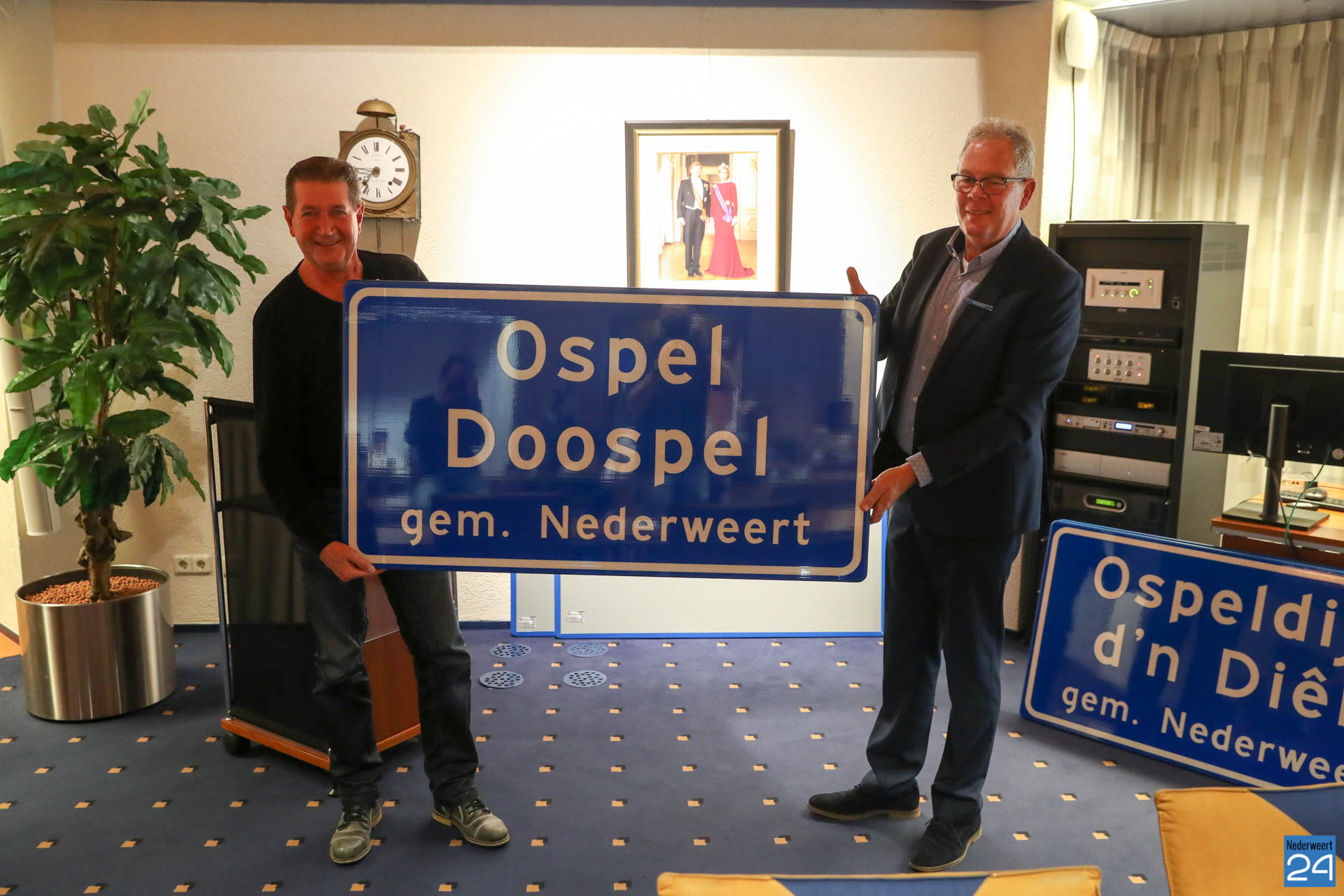 Donderdagavond zijn onder het toeziend oog van dorpsraden, sponsoren, bestuursleden van Heemkundevereniging en het Veldeke de nieuwe ‘komborden‘ van Nederweert onthuld met daarop de kerkdorpen Ni-jwieërt, Doospel, Leivere, d’n Diêk en d’Indj in het dialect.