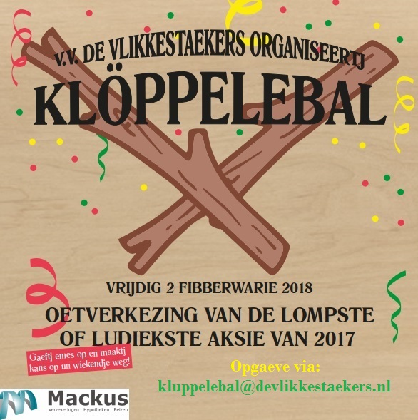 Het klöppelebâl vind plaats op 2 februarie 2018 in het Peeljuweel te Ospel. De genomineerde zullen op 2 februarie de hele zaal buikpijn van het lachen bezorgen. Heb jij de winnaar van de gouden knuppel opgegeven, dan ben jij de winnaar van een reis cheque aangeboden door reisburo Mackus.